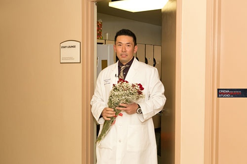 | Nhân dịp có nữ bệnh nhân là người mẫu đến khám, chàng bác sĩ điển trai đã chuẩn bị sẵn hoa hồng. |