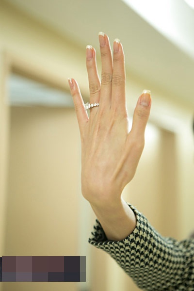 | Ngọc Quyên tự hào khoe chiếc nhẫn cưới vừa được tặng. |
