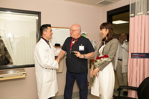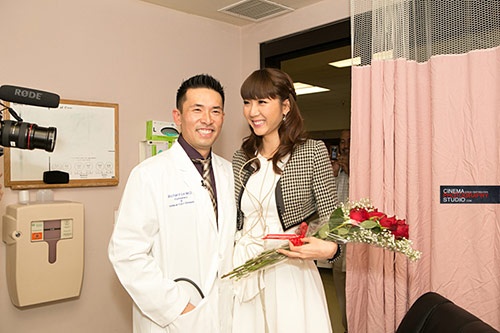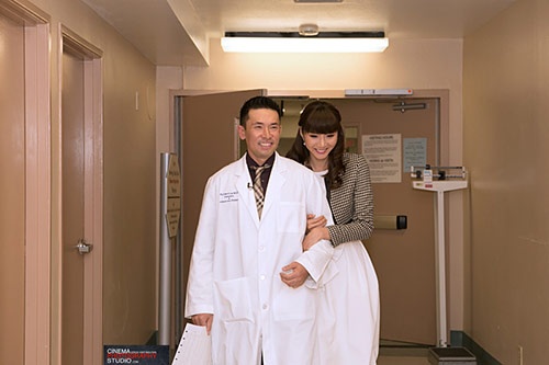 Cặp đôi diễn cảnh một nữ bệnh nhân xinh đẹp được chàng bác sĩ điển trai rút nhẫn, xin cầu hôn.