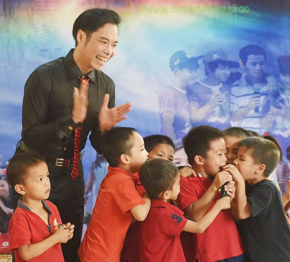 | Trong buổi phát quà Tết, Ngọc Sơn hát, giao lưu cùng các em nhỏ và cán bộ trung tâm nhân đạo tỉnh Bình Dương. |