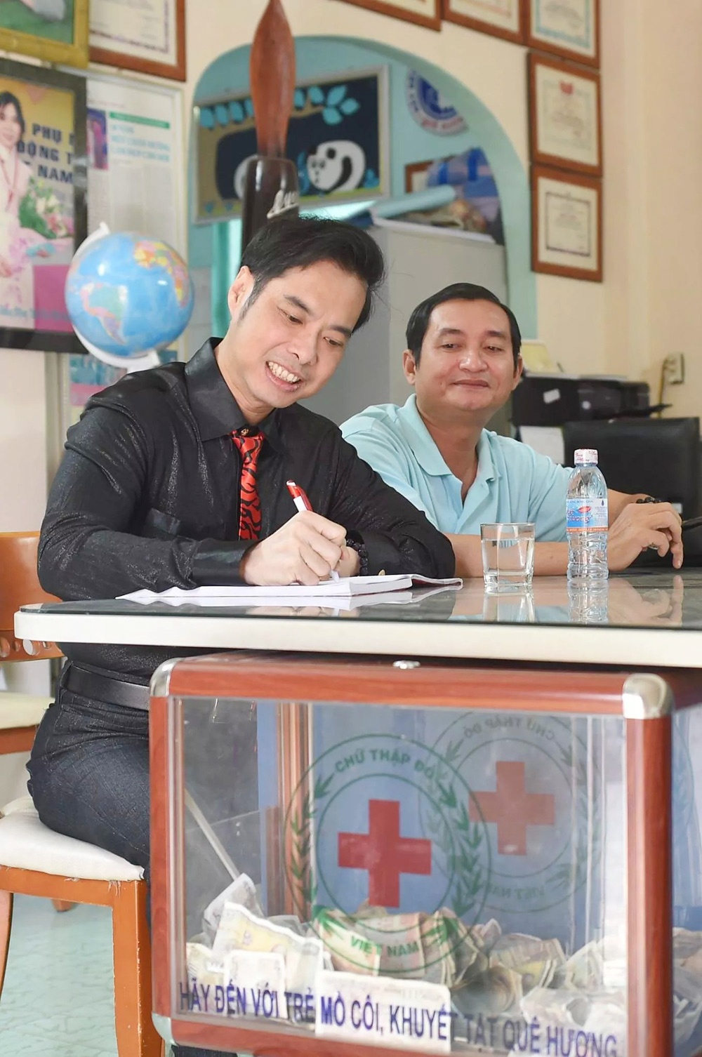 | Nam ca sĩ ký vào sổ công đức tại trung tâm nhân đạo. Anh chia sẻ, Tết này bận rộn lưu diễn xa quê nên tranh thủ đến thăm và tặng quà cho các em nhỏ. |
