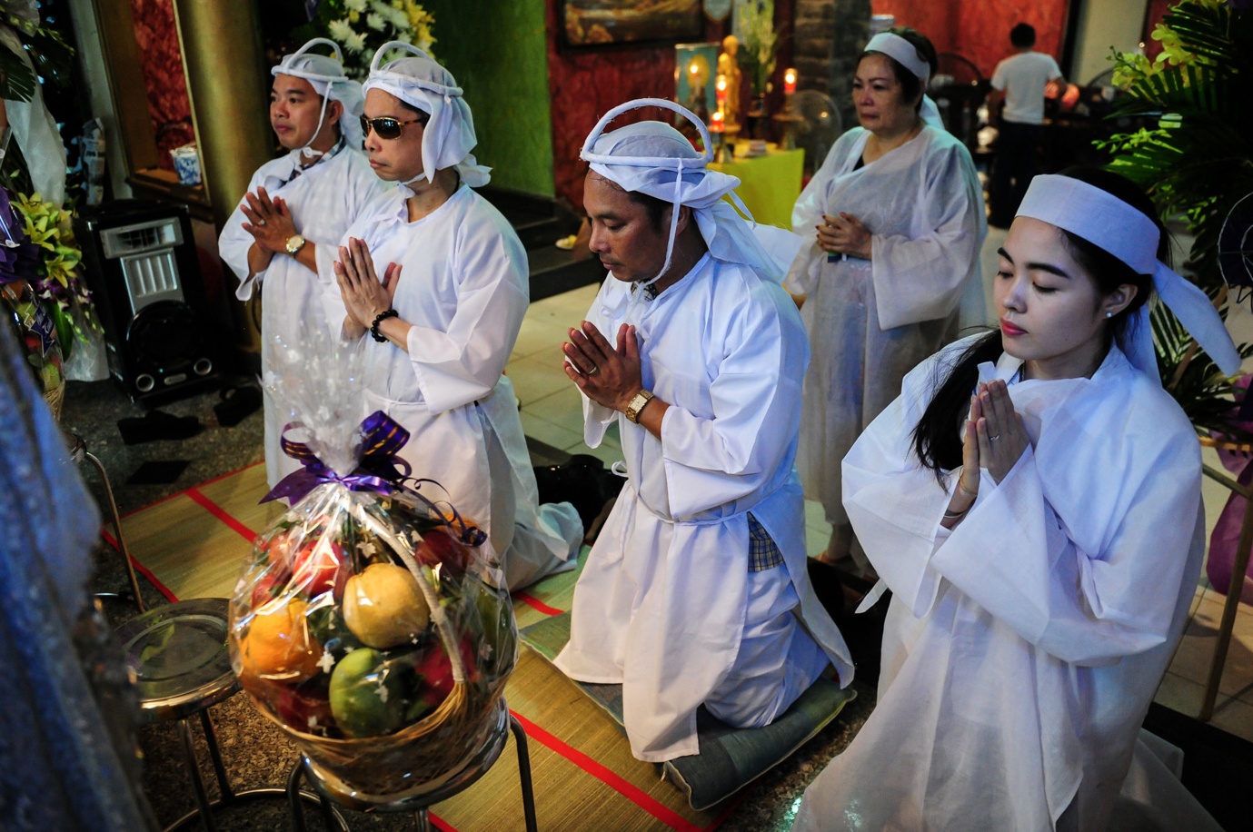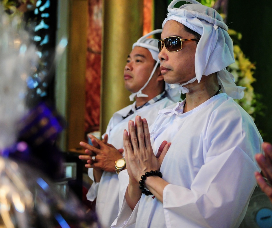 | Ngọc Sơn và hai em trai Ngọc Hà, Ngọc Hải thắp hương trước linh cữu cha. Do khóc nhiều nên nam ca sĩ Đạo làm con bị đau mắt. Anh đeo kính để tránh khói hương. |