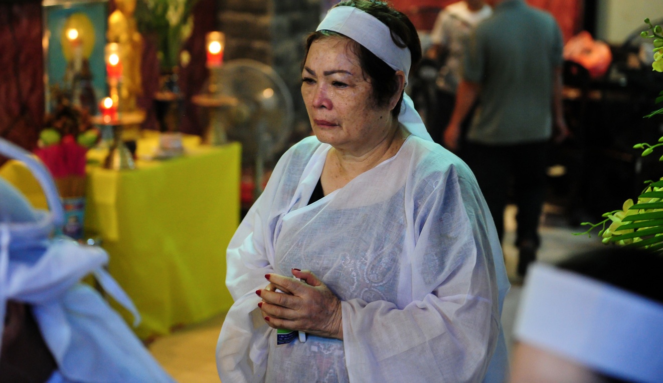| Mẹ Ngọc Sơn - bà Kim Loan - năm nay hơn 70 tuổi khóc nức nở trước linh cữu chồng. Nhiều năm nay, bà luôn bên cạnh động viên, chăm lo sức khỏe ông. |