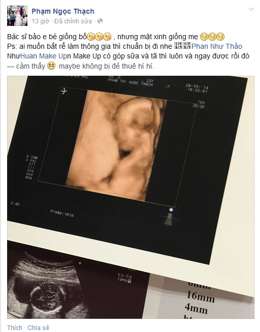 Người đẹp viết: "Bác sĩ bảo em bé giống bố, nhưng mặt xinh giống mẹ. Ai muốn bắt rể làm thông gia thì chuẩn bị đi nhé" và chia sẻ hình siêu âm của con đầu lòng. Ngay khi bức ảnh được công bố, rất nhiều bạn bè, đồng nghiệp và người thân đã vào chúc mừng Ngọc Thạch. Chân dài cẩn thận trả lời từng lời nhắn của mọi người và không giấu được niềm vui sướng khi chuẩn bị lên chức mẹ.