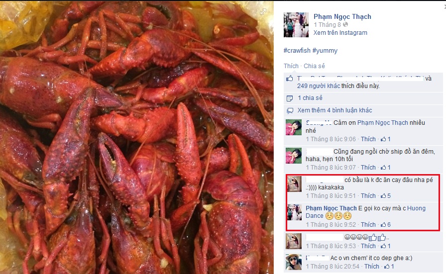 Mới đây, trên trang cá nhân, khi cựu người mẫu chia sẻ một món ăn ngon, bạn bè đã nhắc nhở cô: "Có bầu không được ăn cay đâu nha". Đáp lại bình luận này, Ngọc Thạch cho biết chỉ "gọi không cay".