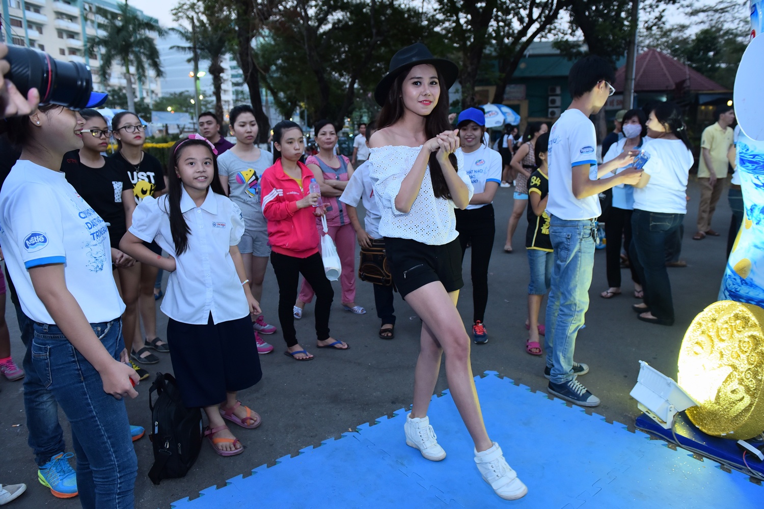 | Cô cùng khán giả tham gia các trò chơi vận động mà chương trình đưa ra. |