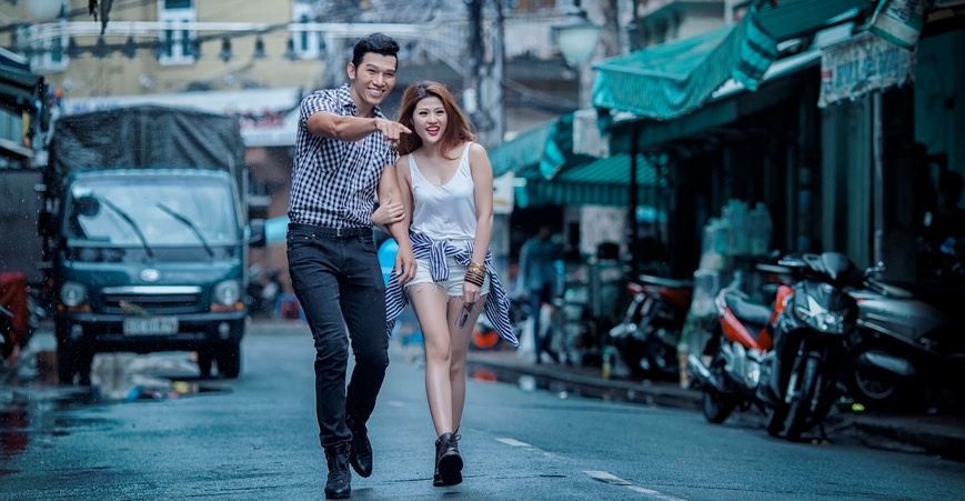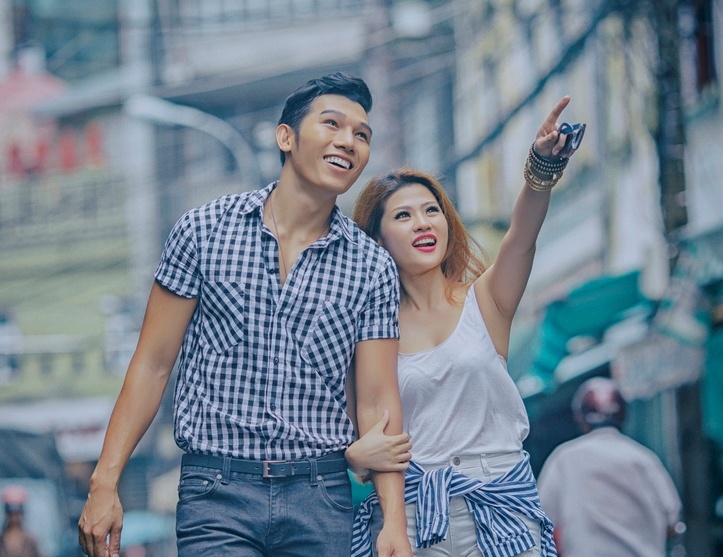 | Ngọc Tình và Ngọc Anh trên đường phố Sài Gòn. |