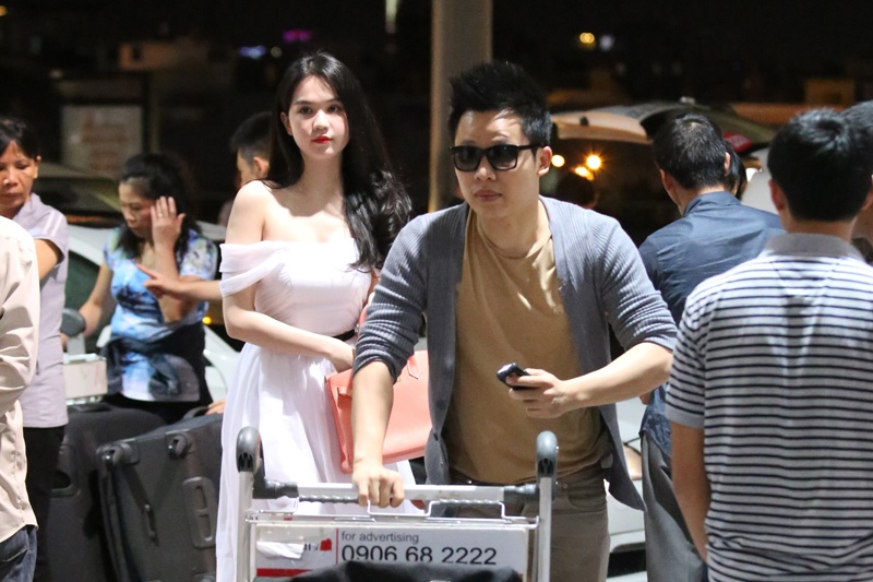 Ngọc Trinh và bầu Vũ Khắc Tiệp được tài xế riêng đưa ra sân bay bằng chiếc BMW màu trắng mà cô mới tậu được vài tháng nay. Sau khi làm thủ tục cho chuyến bay đêm, cả hai ngồi ăn khuya và nói chuyện. Người đẹp miền Tây cũng chăm sóc chu đáo cho ông bầu của mình, cô tận tay đút đồ ăn cho anh.