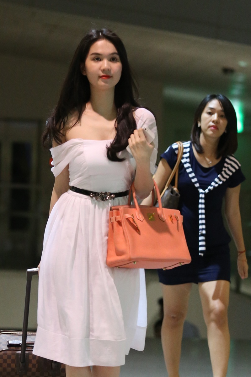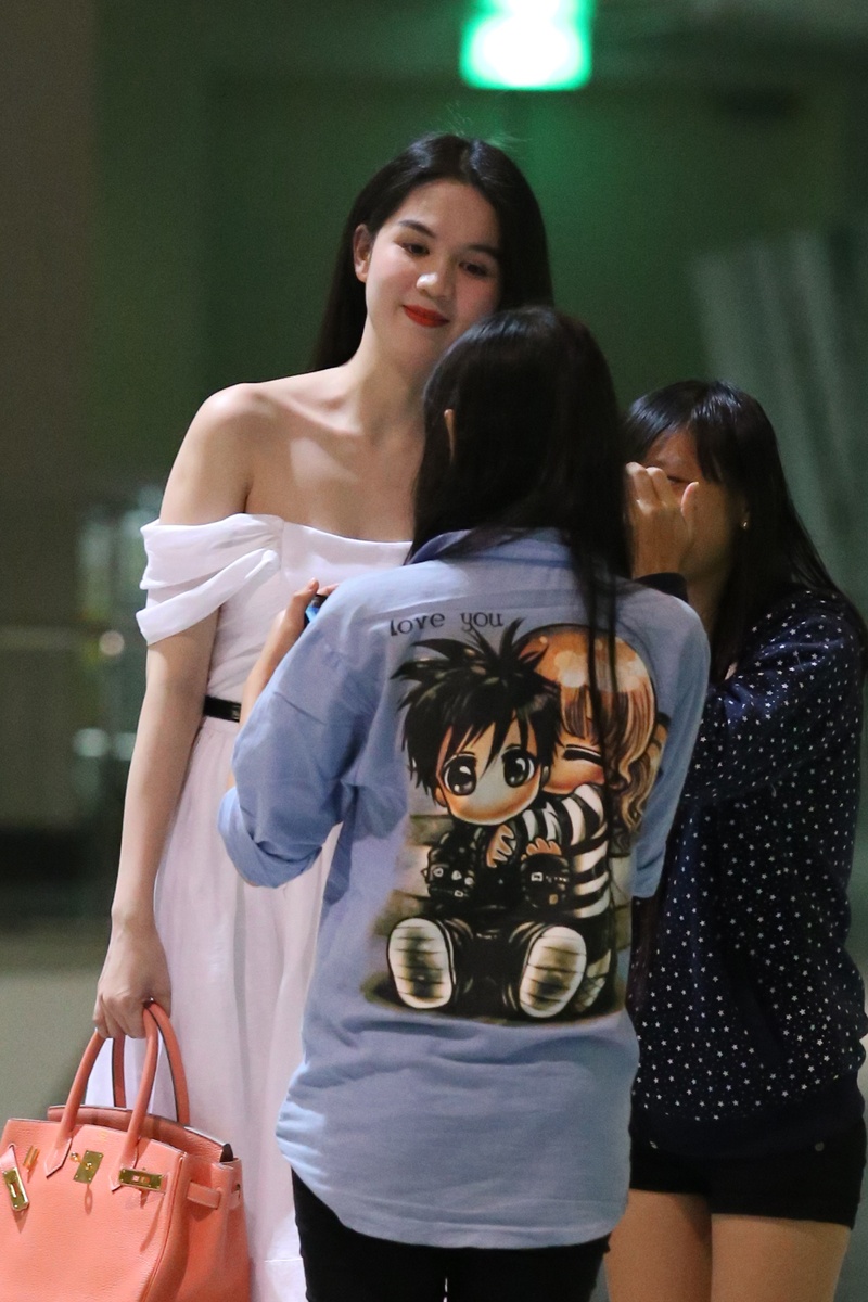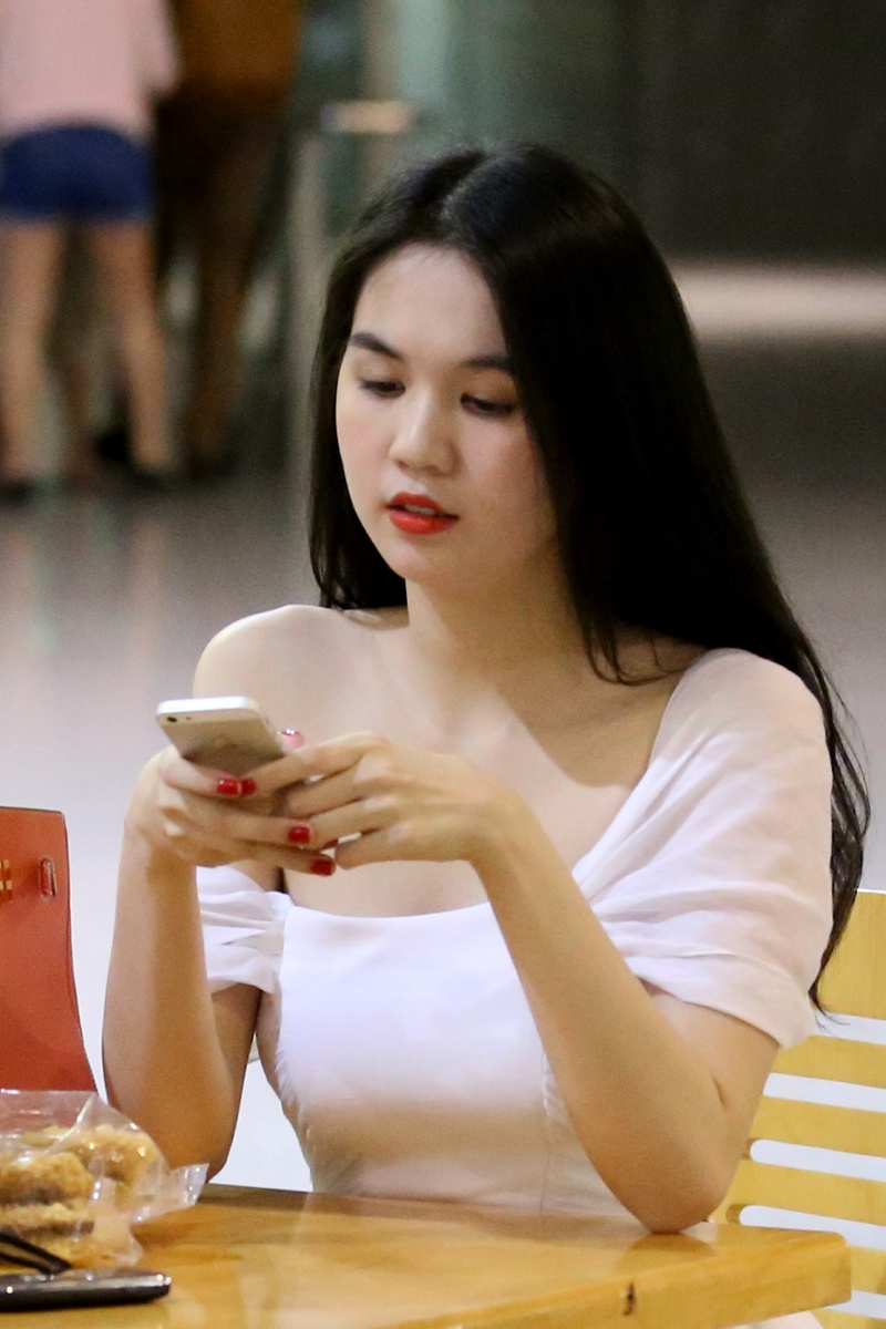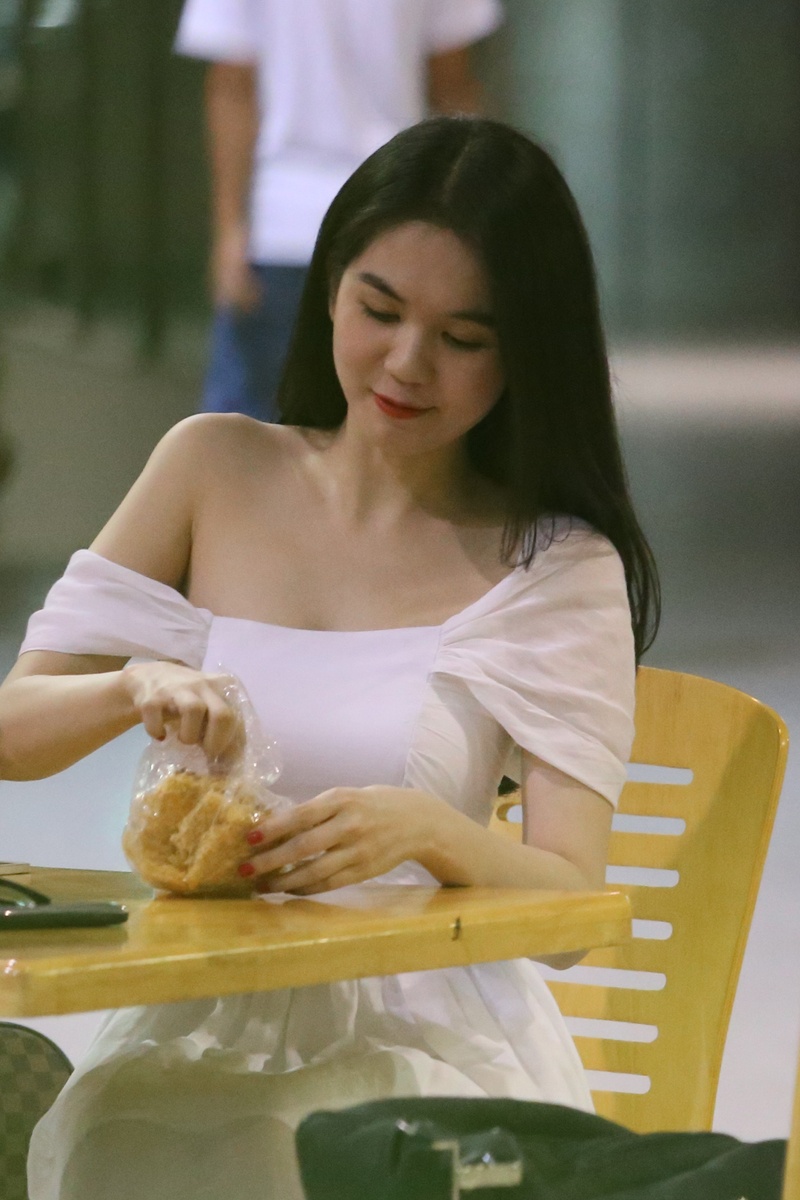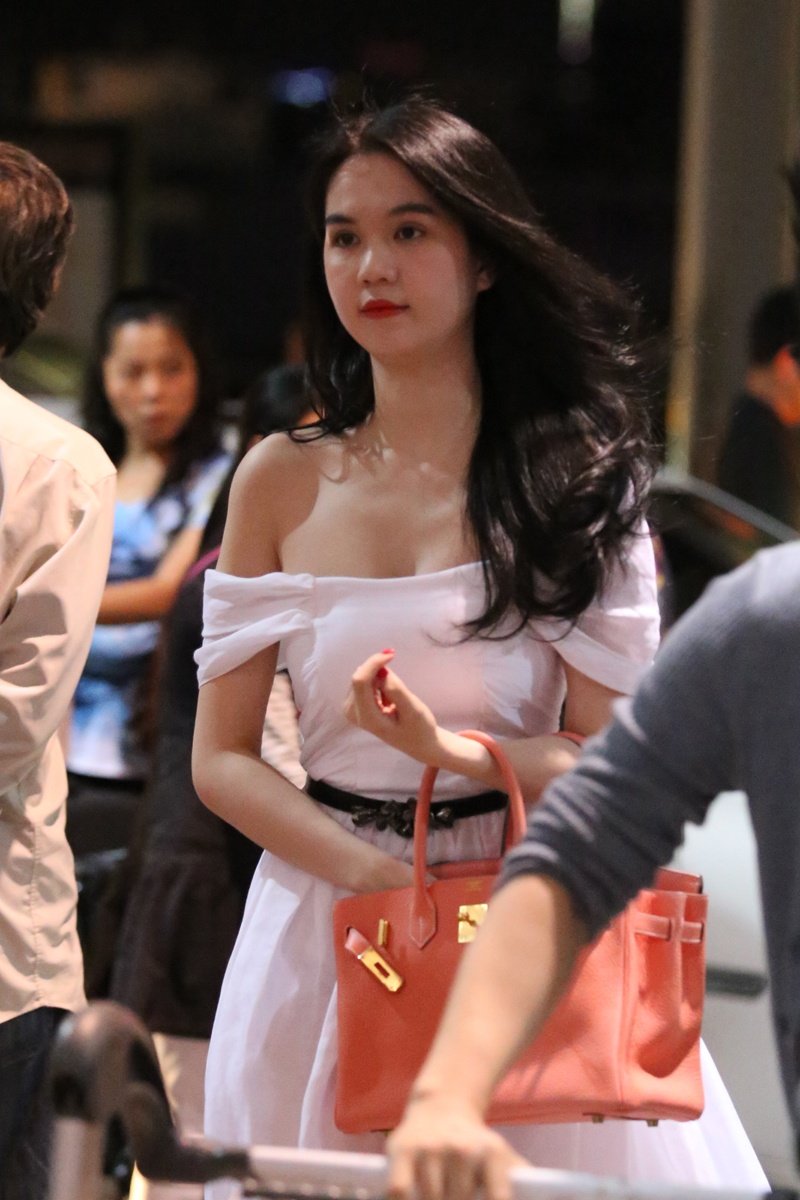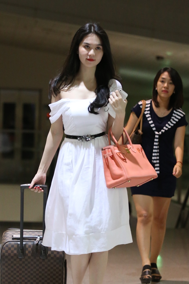 Người đẹp vẫn trung thành với style trẻ trung và dễ thương. Cô thu hút sự chú ý khi xuất hiện ở sân bay khi diện chiếc đầm trễ vai gợi cảm và làn da trắng đặc trưng. Một vài bạn trẻ nhận ra Ngọc Trinh, họ lại xin chữ ký và chụp ảnh kỷ niệm.