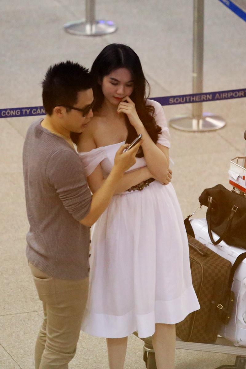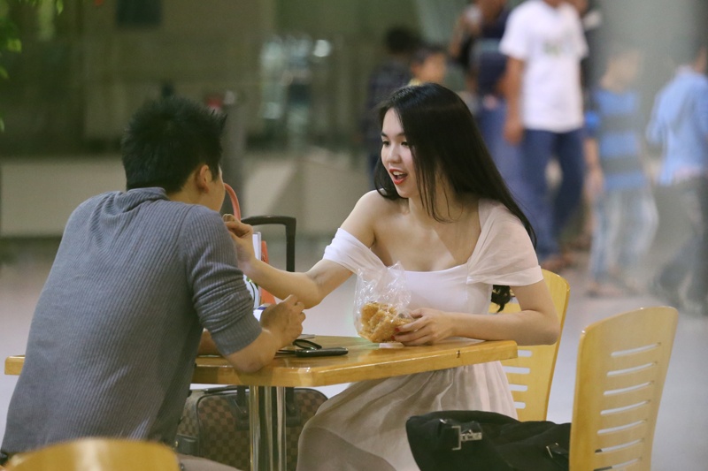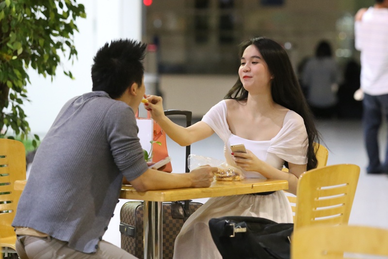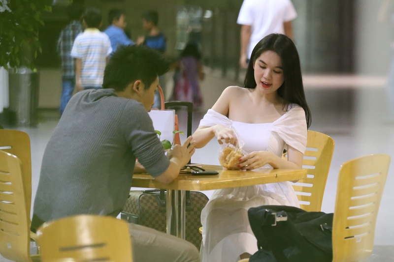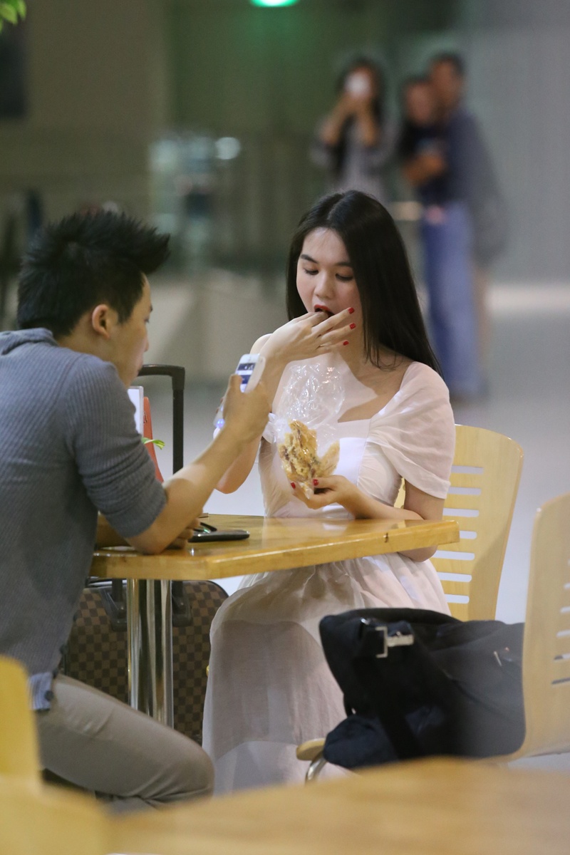 Tối khuya 11/8, "nữ hoàng nội y" và ông bầu điển trai có mặt tại sân bay Tân Sơn Nhất để làm thủ tục đi Hàn Quốc. Ngọc Trinh còn ân cần đút cho Khắc Tiệp ăn ngay giữa sân bay.