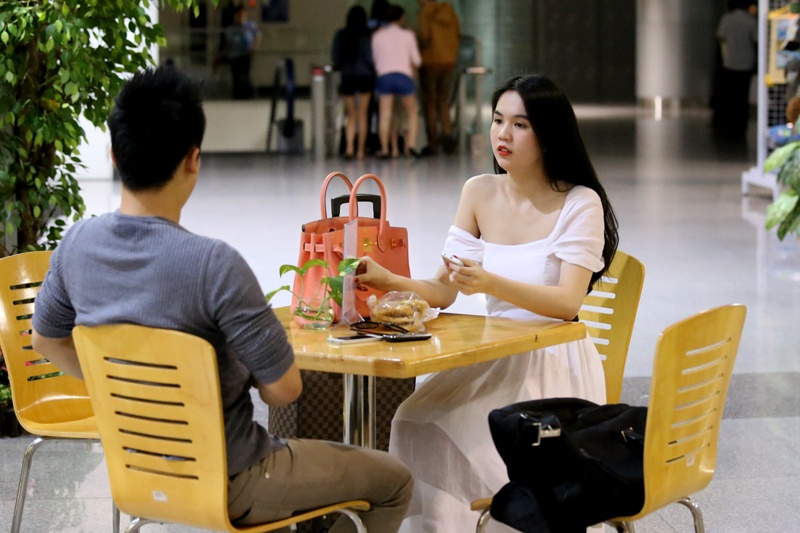 | Cặp đôi ngồi ăn nhẹ trong khi chờ đến giờ bay. |