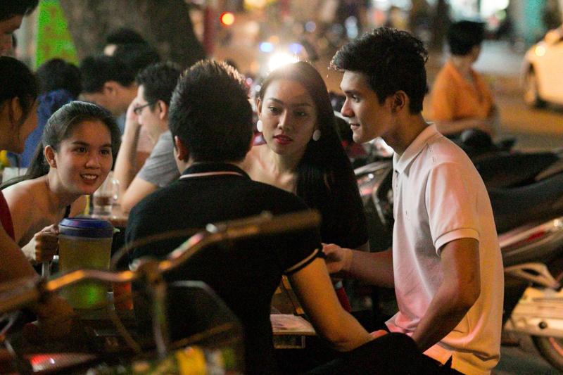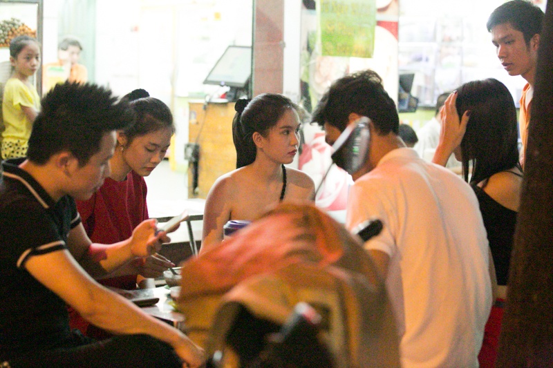 Diệu Huyền và Nhiko Đinh nhập tiệc cùng ông bầu Khắc Tiệp và Ngọc Trinh, Linh Chi. Cả 5 thầy trò chuyện trò vui vẻ và náo nhiệt của một góc quán bình dân.