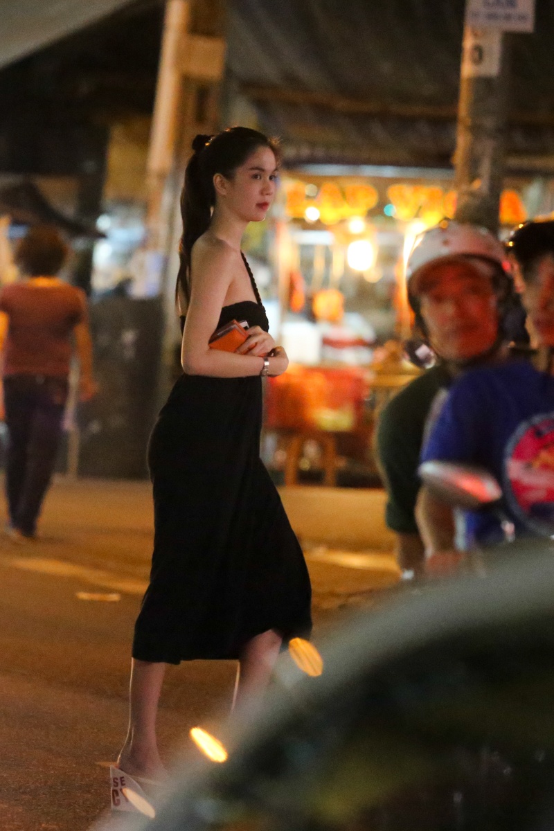 Nhiều người qua lại trên phố khó nhận ra Ngọc Trinh bởi cô ăn vận rất giản dị, trang phục đời thường cùng kiểu tóc gọn gàng khác xa với hình ảnh lộng lẫy khi cô xuất hiện tại các buổi tiệc của giới showbiz.