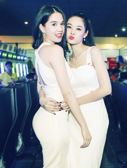 | Ngọc Trinh khá thân thiết với Linh Chi. Cô cũng là người tư vấn về trang phục cho đàn em trong suốt thời gian qua. Á hậu phụ nữ Việt Nam qua ảnh 2012 diện bộ đầm tông trắng, đồng màu cùng Ngọc Trinh khi đến dự tiệc. |