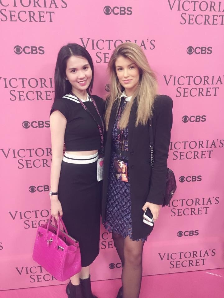 | Khi thăm quan tổng duyệt, Ngọc Trinh còn được vào hậu trường, nơi các người mẫu bận rộn diễn tập, lo trang phục. Cô chụp ảnh cùng chân dài người Hà Lan - Douzten Kroes - một trong những thiên thần chính của Victoria's Secret. |