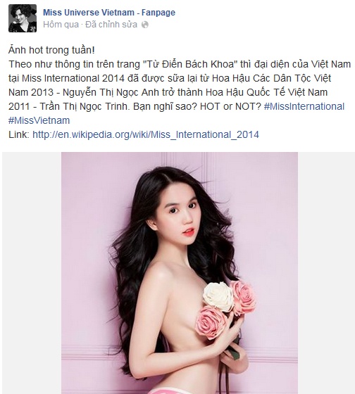 | Trang facebook Miss Universe Vietnam đính chính, người đẹp Ngọc Anh mới là gương mặt đại diện Việt Nam tại đấu trường quốc tế. |