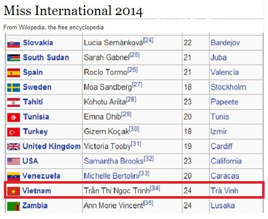 | Thông tin Ngọc Trinh được chọn làm đại diện Việt Nam dự Hoa hậu Quốc tế được đăng tải trên Wikipedia. |
