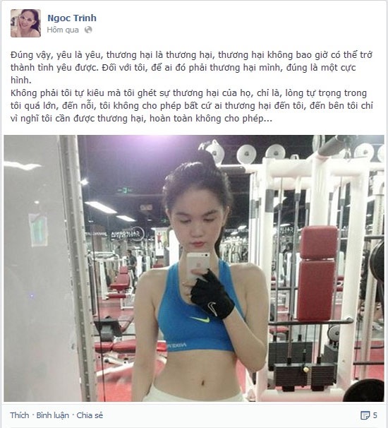 Nguyên văn dòng status của Ngọc Trinh như sau: "Đúng vậy, yêu là yêu, thương hại là thương hại, thương hại không bao giờ có thể trở thành tình yêu được. Đối với tôi, để ai đó phải thương hại mình, đúng là một cực hình.