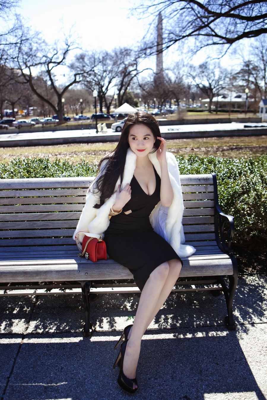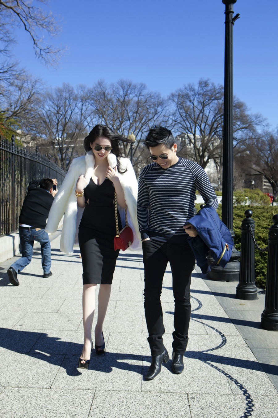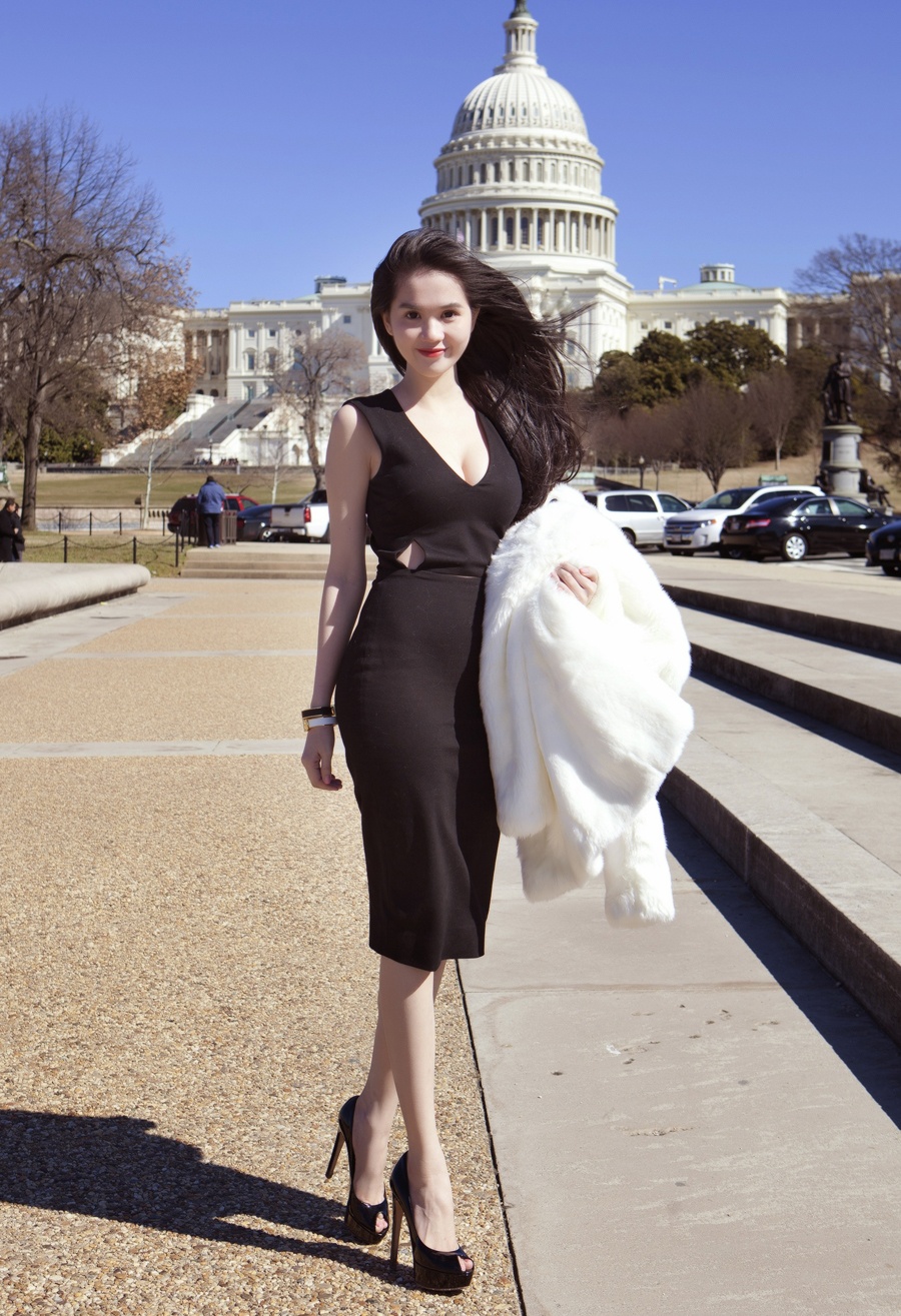 Vốn là những người mẫu có phong cách thời trang sành điệu và hợp mốt, dàn mỹ nhân thuộc công ty Venus luôn chu đáo trong công tác chuẩn bị trang phục, trang điểm phù hợp để tự tin khi xuất hiện trên những con phố nổi tiếng ở các tiểu bang. Lần này, Ngọc Trinh diện trang phục váy ôm sát, cổ áo mở rộng gợi cảm. Bộ cánh tông màu đen làm nổi bật làn da trắng ngần.