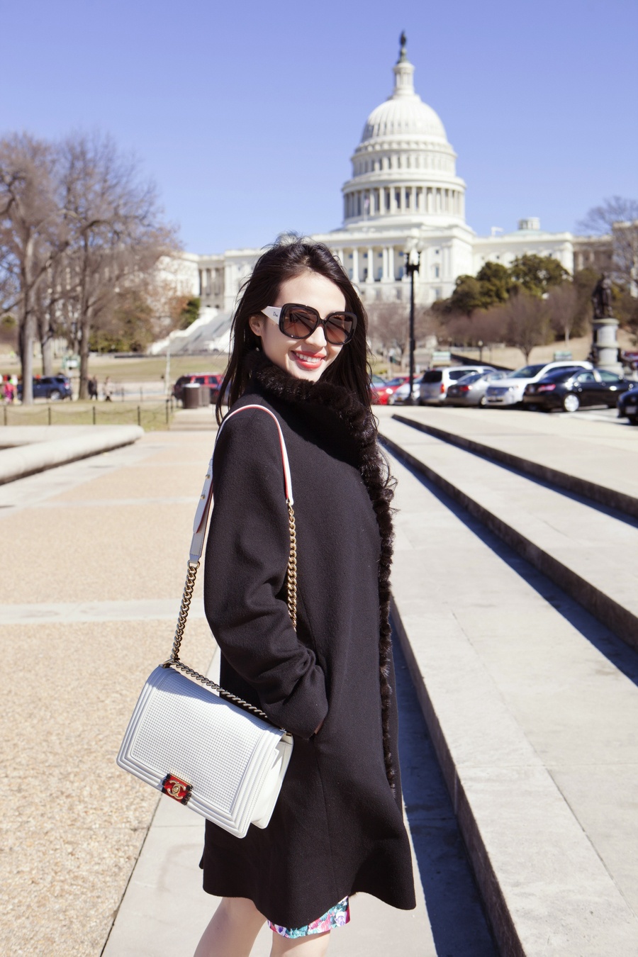 Á hậu Minh Thư diện trang phục ấm áp với măng tô tối màu viền lông và túi xách Chanel đẳng cấp.