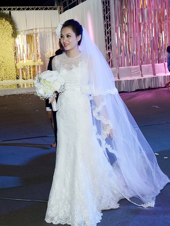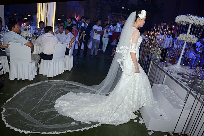 Ngọc Thạch diện một chiếc váy ren có phần đuôi khá cầu kỳ và kín đáo hơn hẳn hôn sự tổ chức ở Hậu Giang hồi đầu tháng 9.