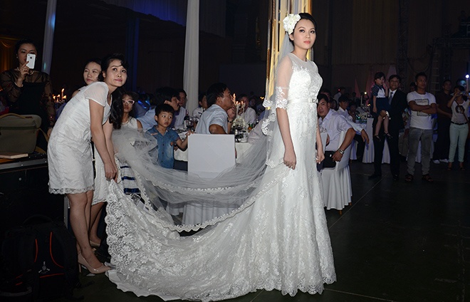 Vì đuôi váy quá dài, Ngọc Thạch phải nhờ người giúp nâng váy khi di chuyển.