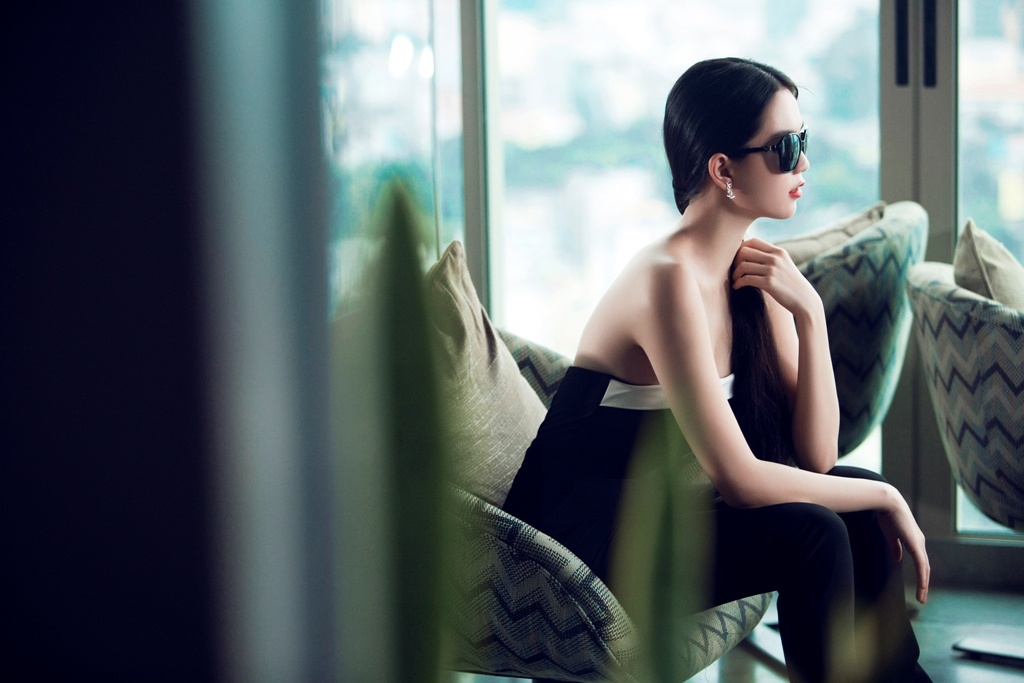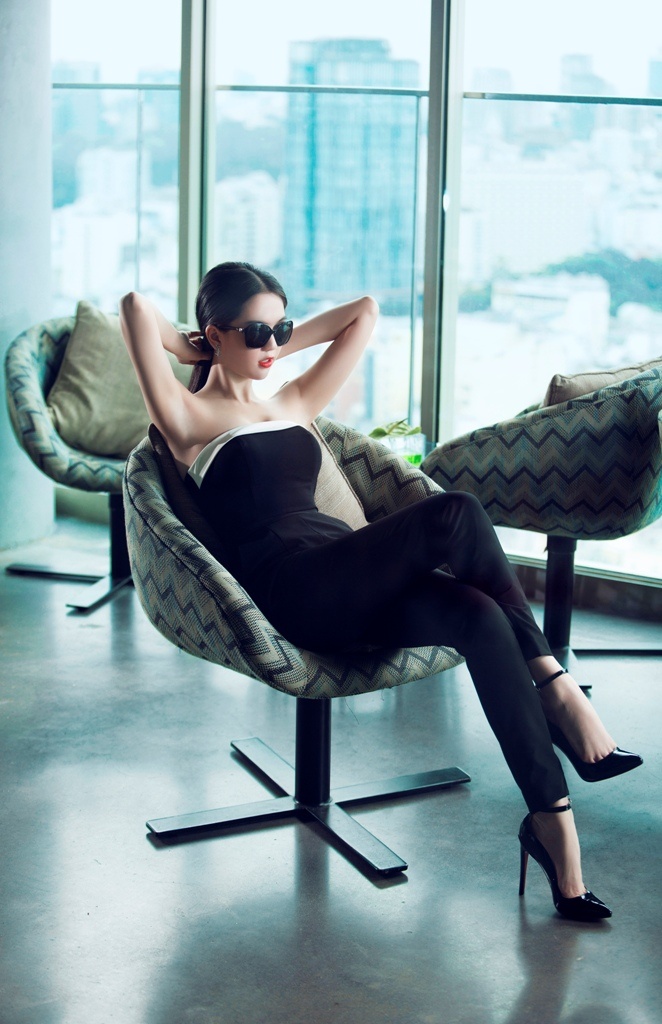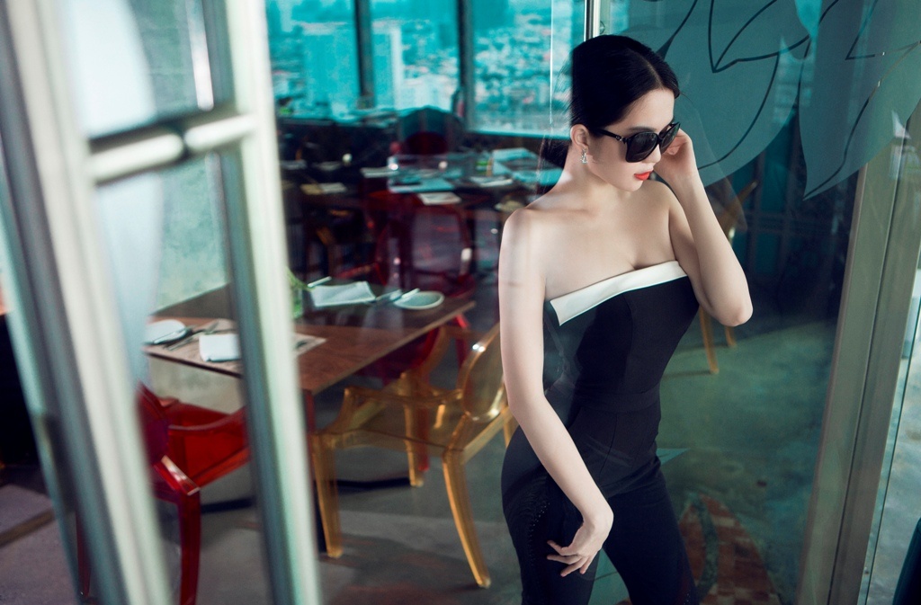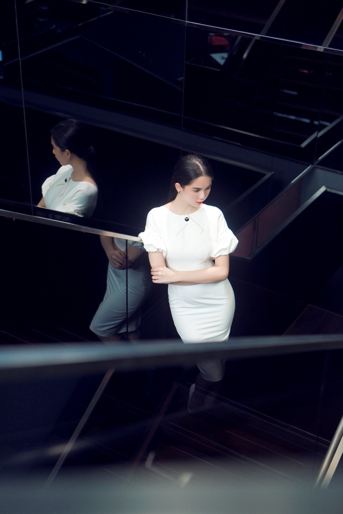 | Cũng trong bộ ảnh được thực hiện ở một tòa cao ốc ở Sài Gòn này, Ngọc Trinh có những khoảnh khắc nữ tính và quyến rũ với đầm ôm và son môi đỏ. |