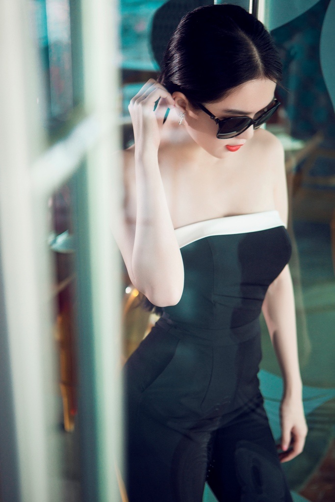 | Bộ cánh ôm sát khoe vai trần này giúp cô khoe được vẻ sexy hút mắt nhìn. Kính và phụ kiện đi cùng hợp tông càng giúp Ngọc Trinh thể hiện được hình ảnh sành điệu và thanh lịch của một doanh nhân kinh doanh lĩnh vực thời trang. |