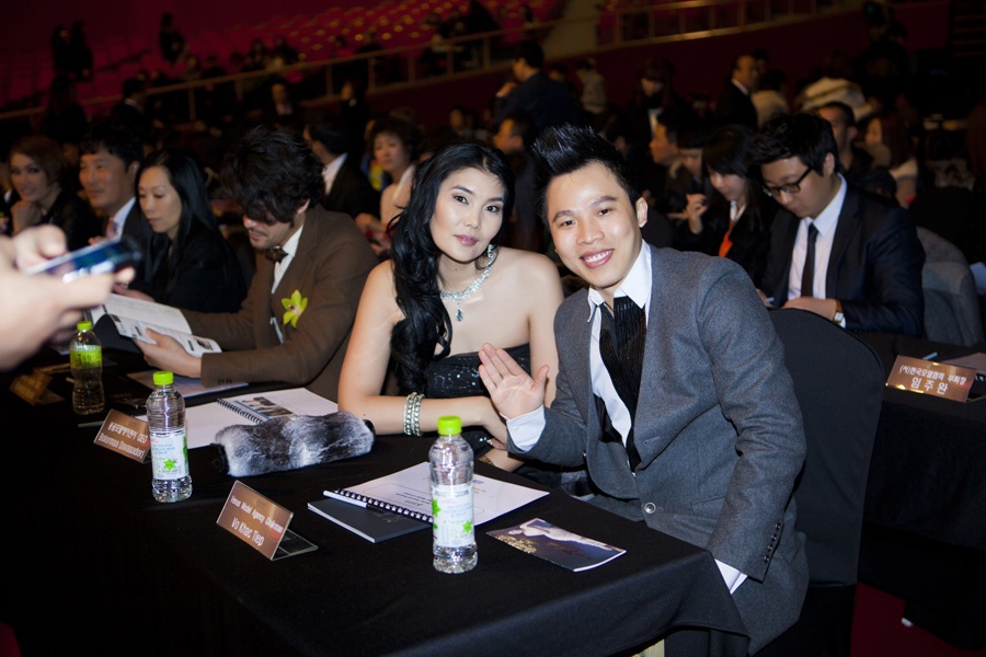 ''Nữ hoàng nội y'' diện váy ôm sát, cổ áo xẻ sâu gợi cảm, còn nam người mẫu ăn mặc lịch lãm khi tham dự đêm thi ''Người mẫu trẻ châu Á'', diễn ra tại Hàn Quốc.