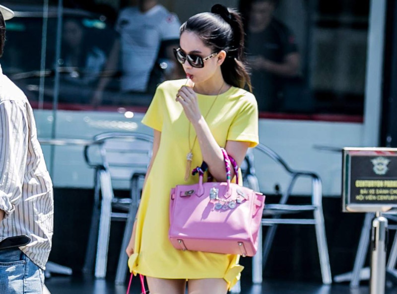 | Ngọc Trinh nổi bật trên phố với chiếc túi xách hàng hiệu và phong cách thời trang sành điệu. |