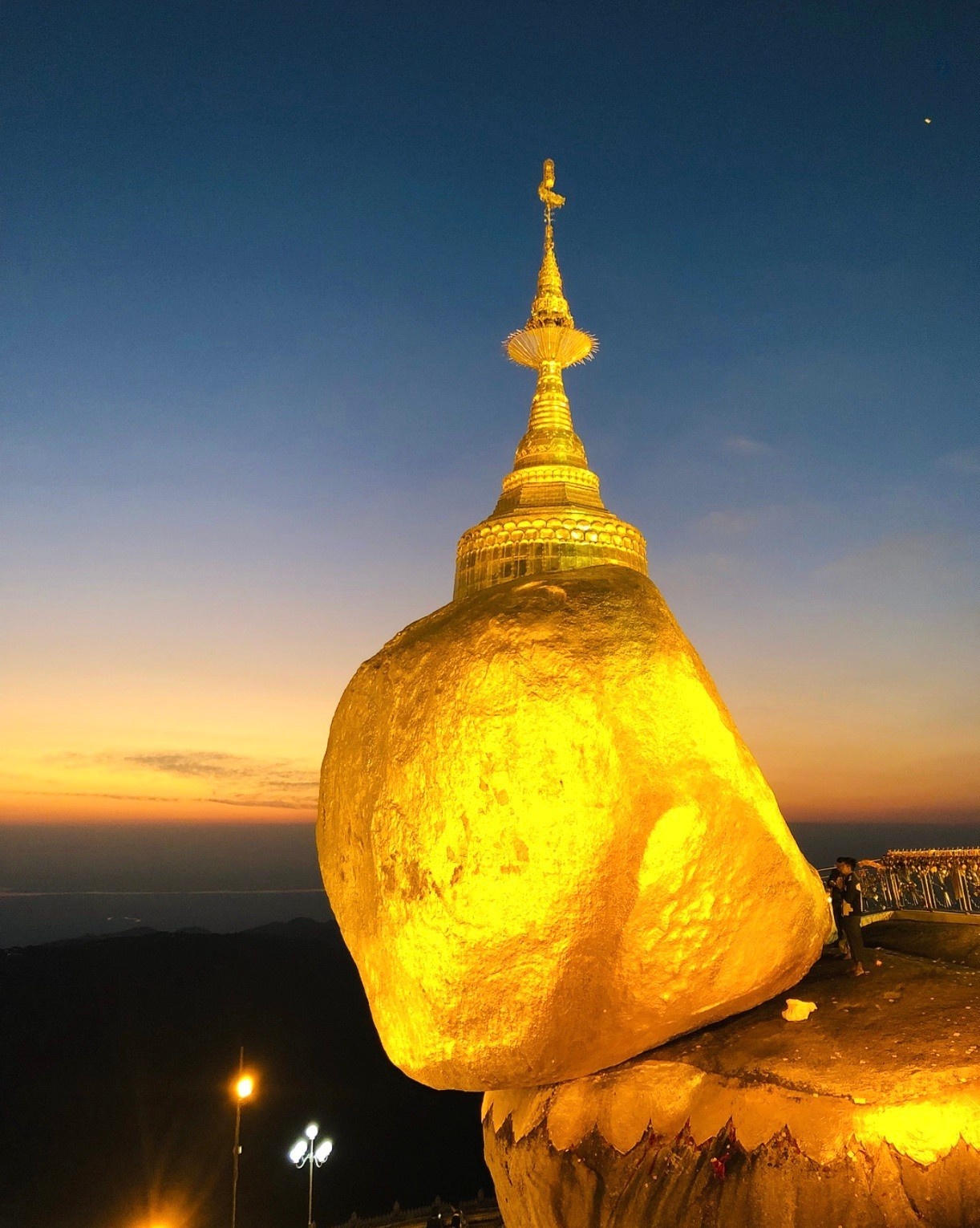 Theo truyền thuyết, Đức Phật khi xuống hạ giới đã tặng một sợi tóc cho vị ẩn sĩ tên TaikTha. Trước khi qua đời, TaikTha trao sợi tóc lại cho người con nuôi là vua với mong muốn: "Hãy cất giữ xá lợi này trong hòn đá có hình dáng như đầu của vị ẩn sĩ". Vua Tissa tìm đến hòn đá nằm trên đỉnh núi Kyaiktiyo để cất giấu tóc của Đức Phật, rồi cho xây dựng ngôi chùa tại đây. Người ta tin rằng, nhờ có sợi tóc của Đức Phật, hòn đá này nằm yên trên một vị trí cheo leo, hiểm hóc hàng nghìn năm qua. Ảnh: Taichatchadaporn. |