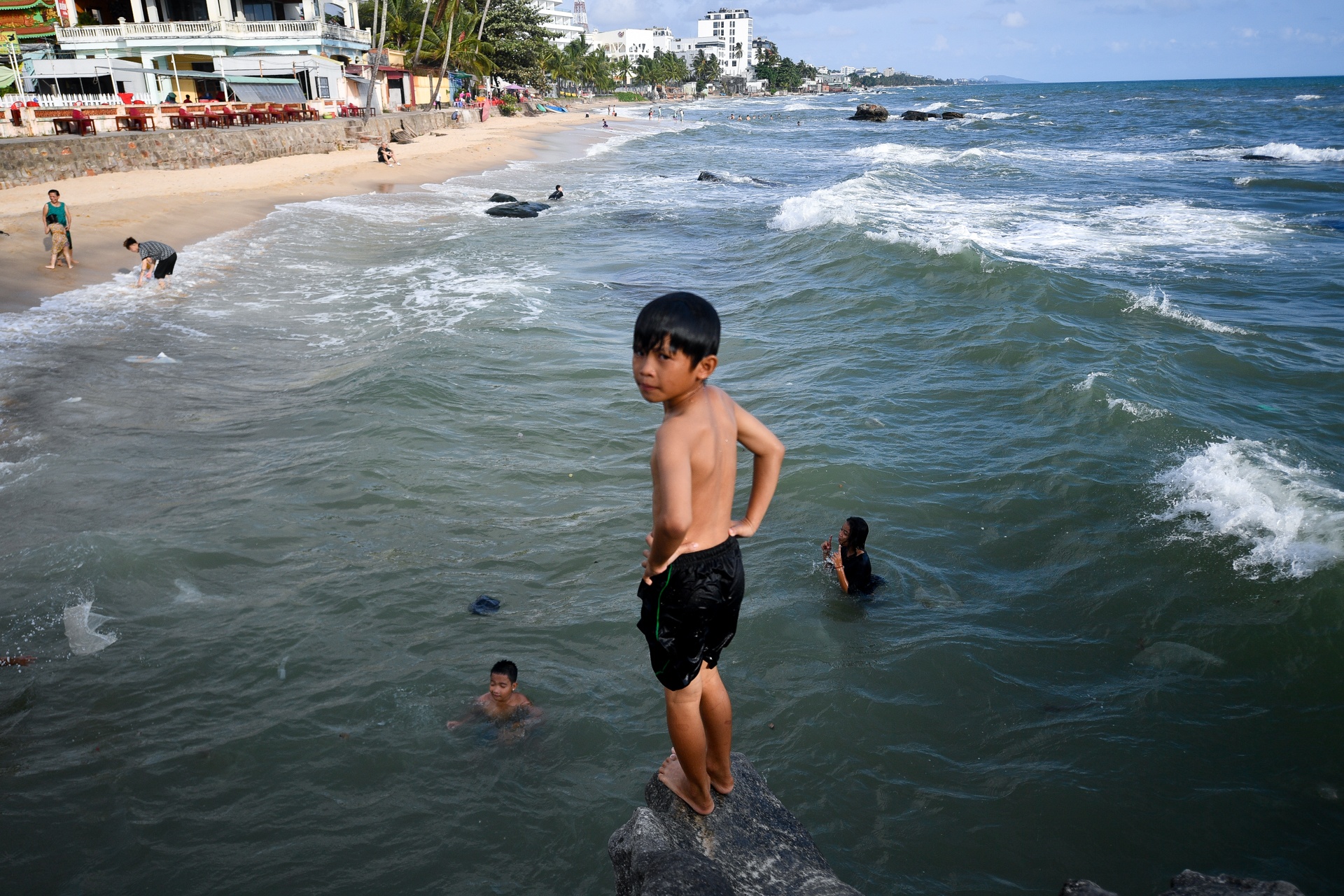 Không chỉ thu hút khách du lịch, những đứa trẻ trên đảo ngọc cũng thường xuyên đến ngôi đền để dạo chơi trên những mỏm đá, tắm cùng những con sóng đổ vào bờ.