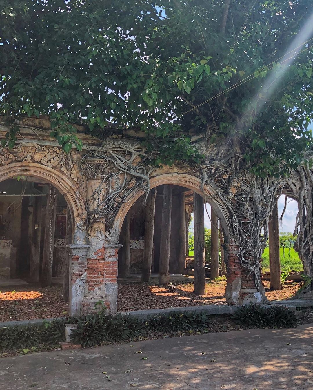| Dù bên trong mục nát, ngôi đình vẫn đứng vững qua năm tháng nhờ sự nâng đỡ của 2 cây bồ đề mọc trên mái. Rễ cây vươn bám vào tường rồi đâm sâu xuống đất. Đối với người dân nơi đây, ngôi đình được coi như báu vật, chốn linh thiêng. Ảnh: Kyuubei.nguyen. |