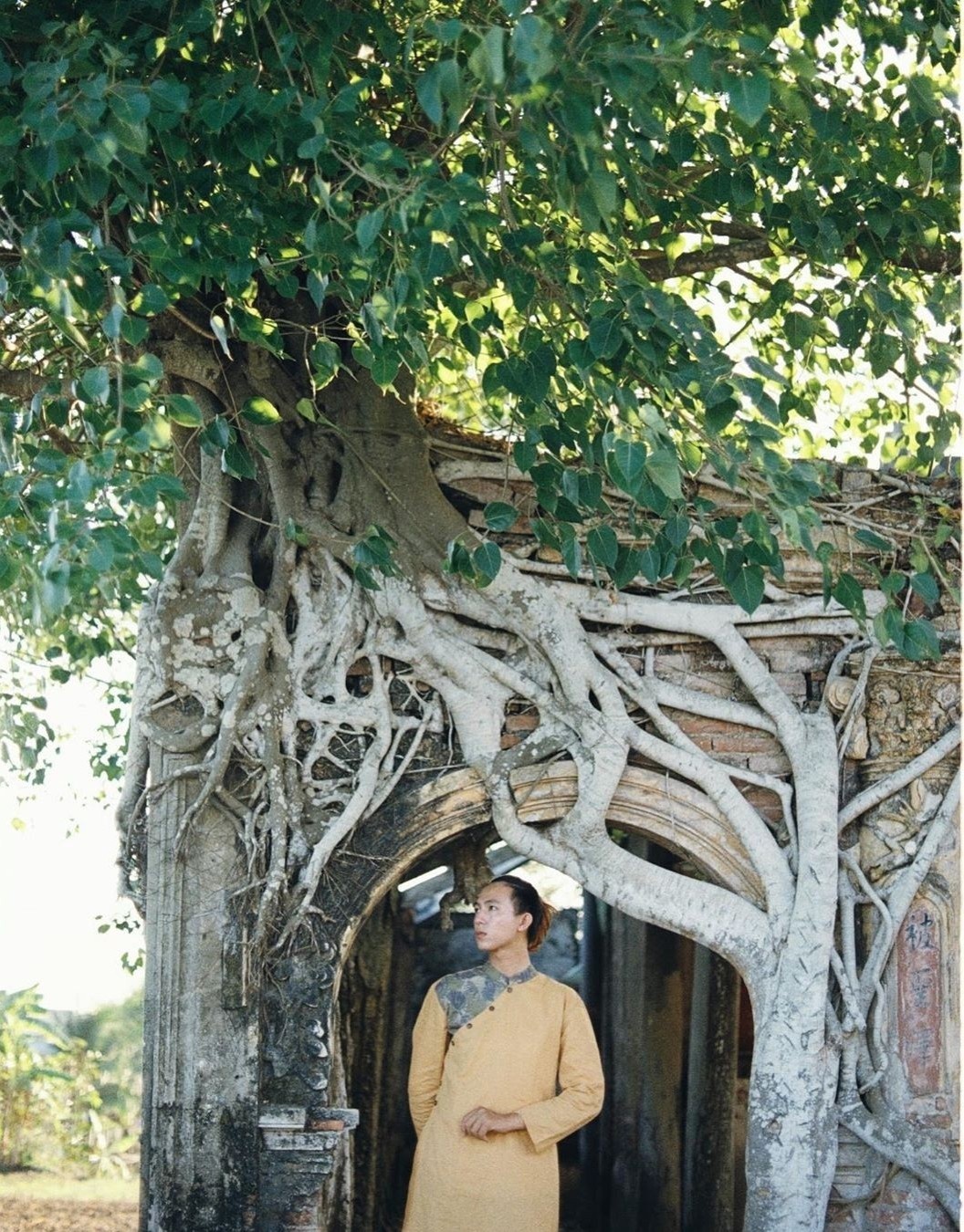 Với kiến trúc cổ xưa, mặt tiền là bức tường có năm vòm cửa được bao bọc bởi những búi rễ bồ đề chằng chịt, ngôi đình cổ dần trở thành điểm check-in quen thuộc của giới trẻ. Du khách có thể đến đây theo quốc lộ 50, gặp hương lộ 13, sau đó đi đường Mạc Văn Thành, hỏi thăm người dân về đình Tân Đông. Ảnh: Kyuubei.nguyen. |