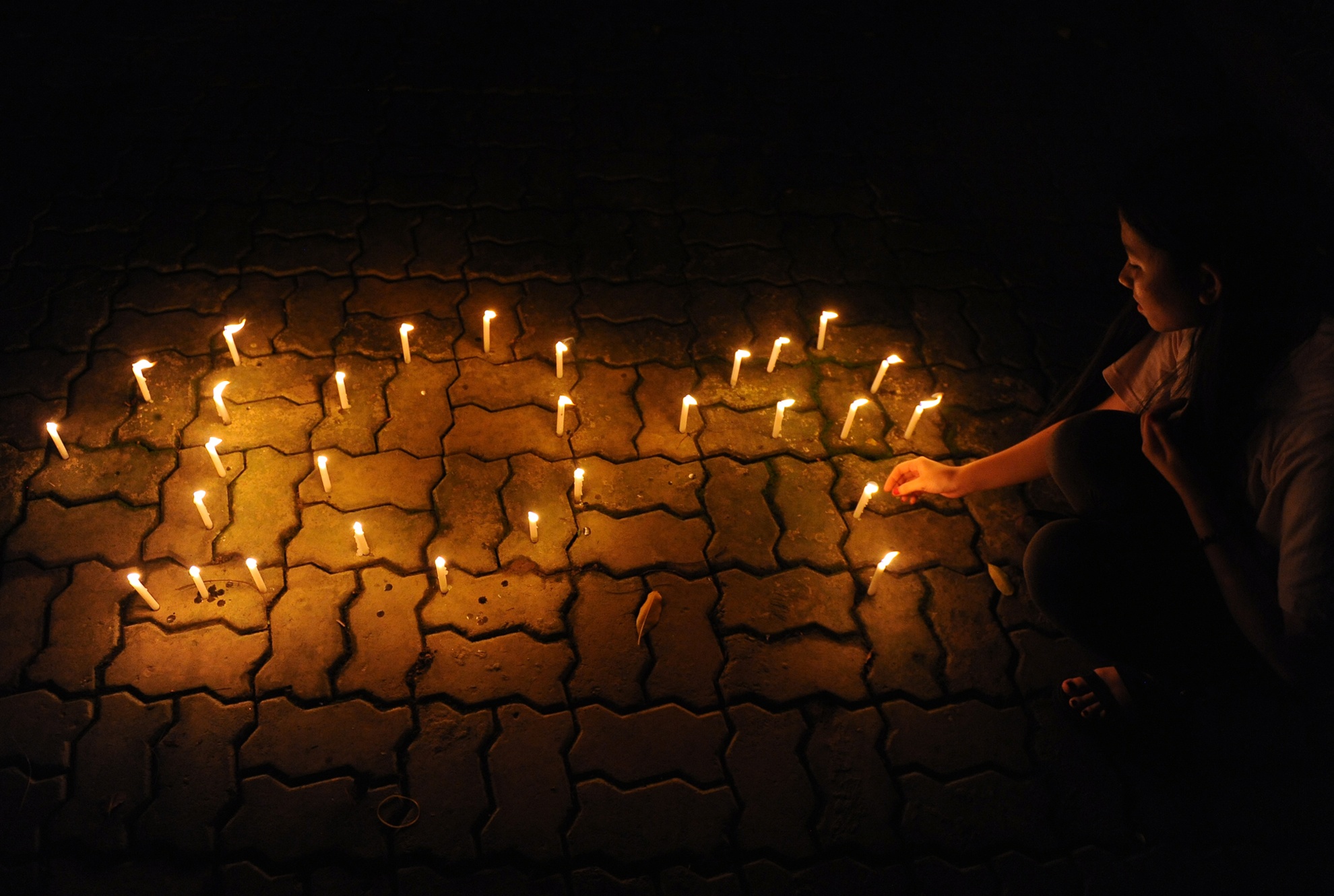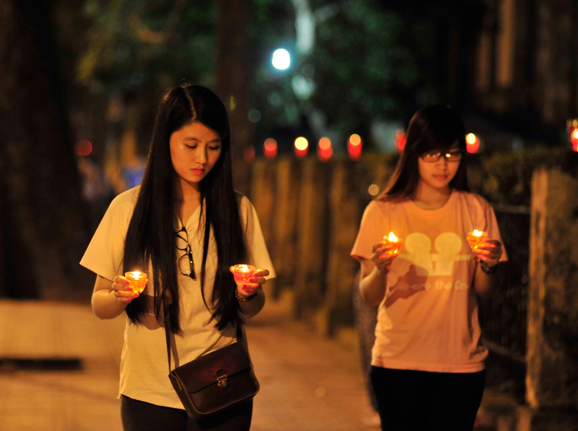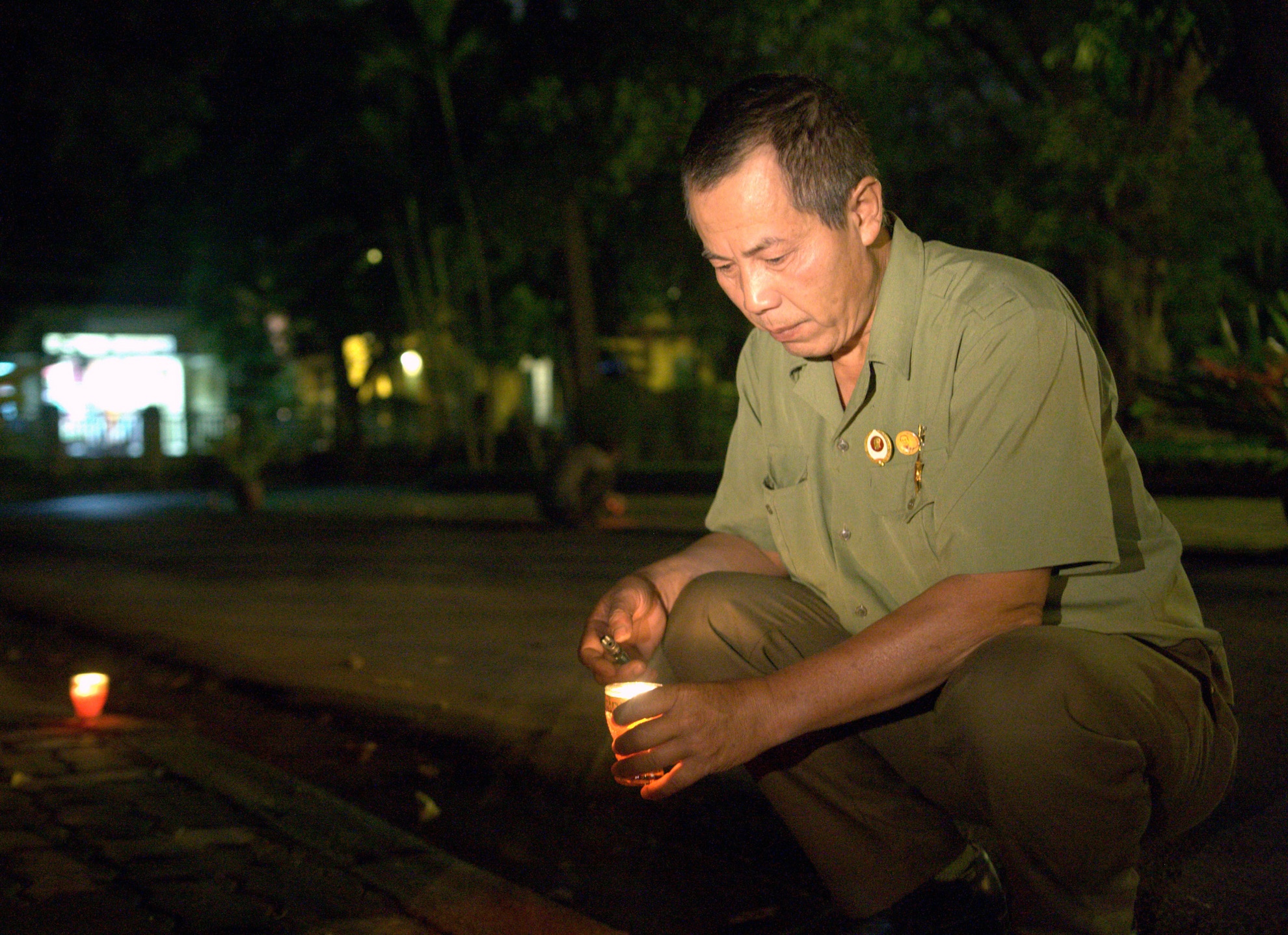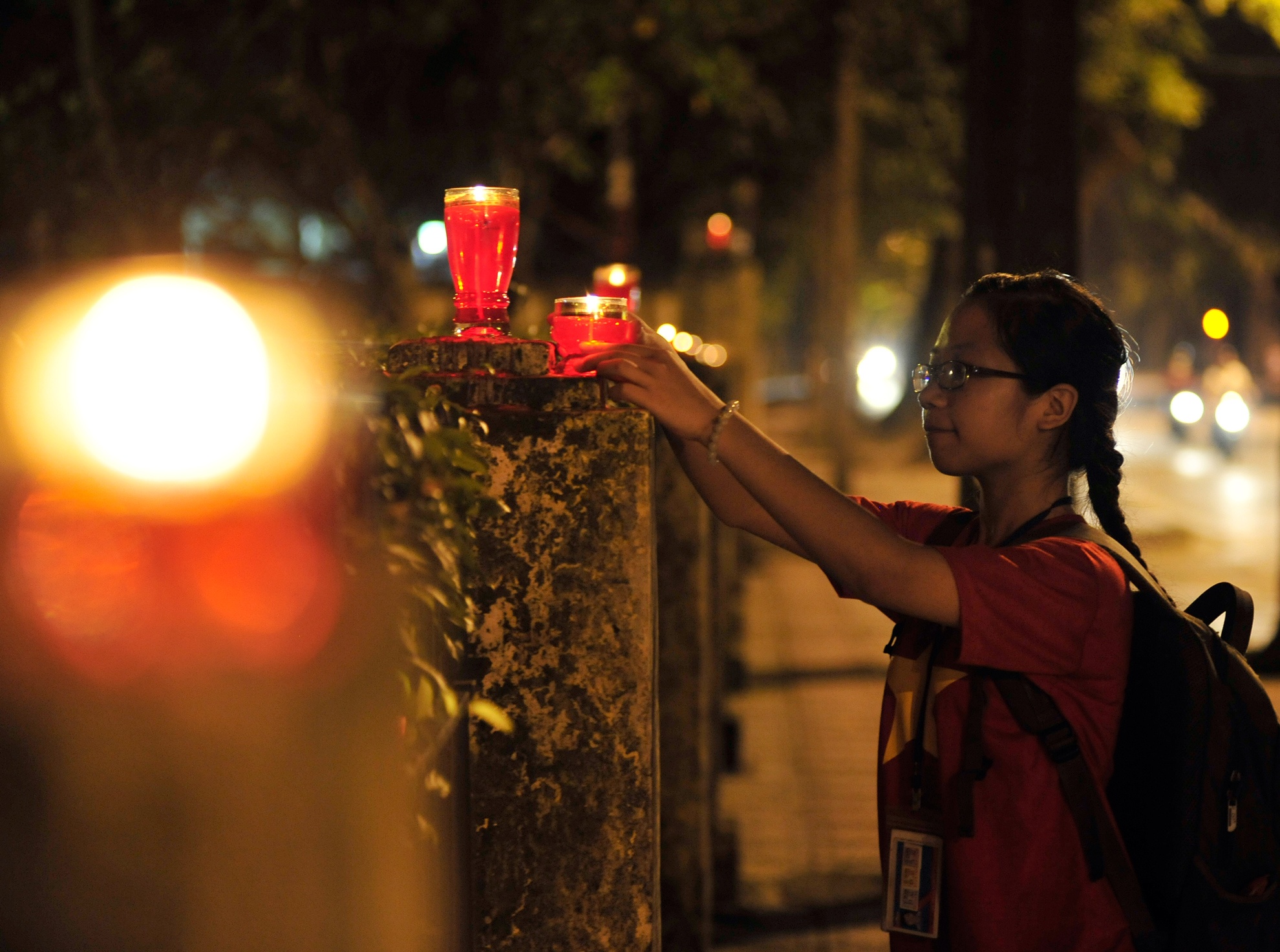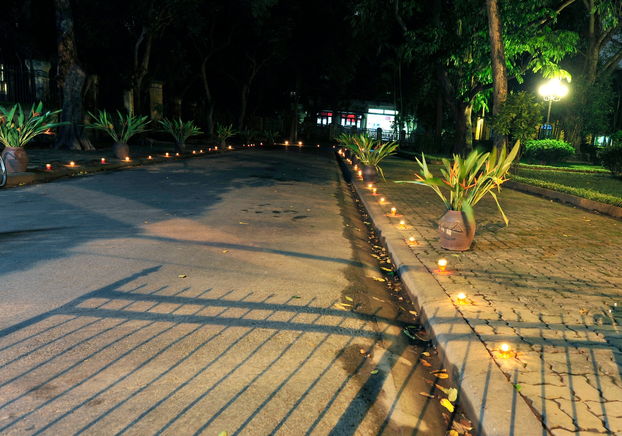 Lối vào nhà 30 Hoàng Diệu sáng bừng. Ngay từ chiều các cựu chiến binh, người dân và chủ yếu là sinh viên đến sớm thắp nến, cắm hoa.