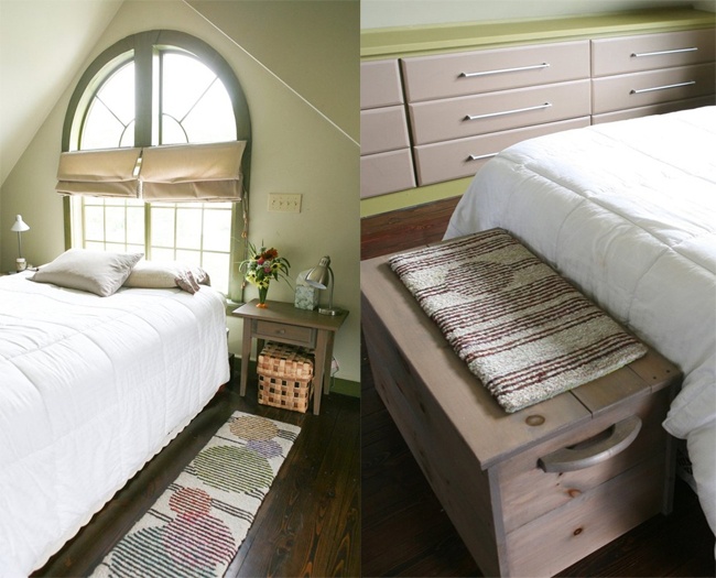 Phòng ngủ lớn mang màu sắc trắng với khung cửa sổ lớn. Còn phòng ngủ thứ 2 đặt trên phòng áp mái với tường gỗ và những họa tiết trang trí màu sắc và ga họa tiết thổ cẩm.