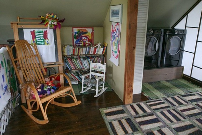 | Góc đọc sách với chiếc ghế bấp bênh mua từ cửa hàng đồ cũ. |