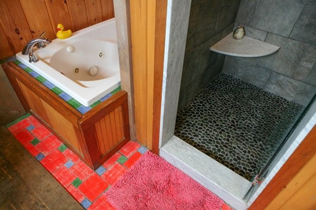 | Sàn phòng tắm lát đá cuội mang từ biển về. |