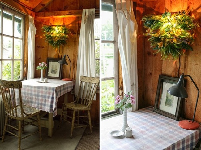 | Bàn nước với cửa sổ nhìn ra vườn và đèn treo ấn tượng. |