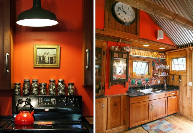 Tường bếp được sơn màu da cam và dưới tác động của ánh sáng, màu sơn tường sẽ có những biến chuyển thành màu đỏ. Thực tế là nội thất của căn bếp này khá hiện đại nhưng lại được ẩn giấu trong một thiết kế cổ điển với tủ gồm những họa tiết trang trí dân gian.