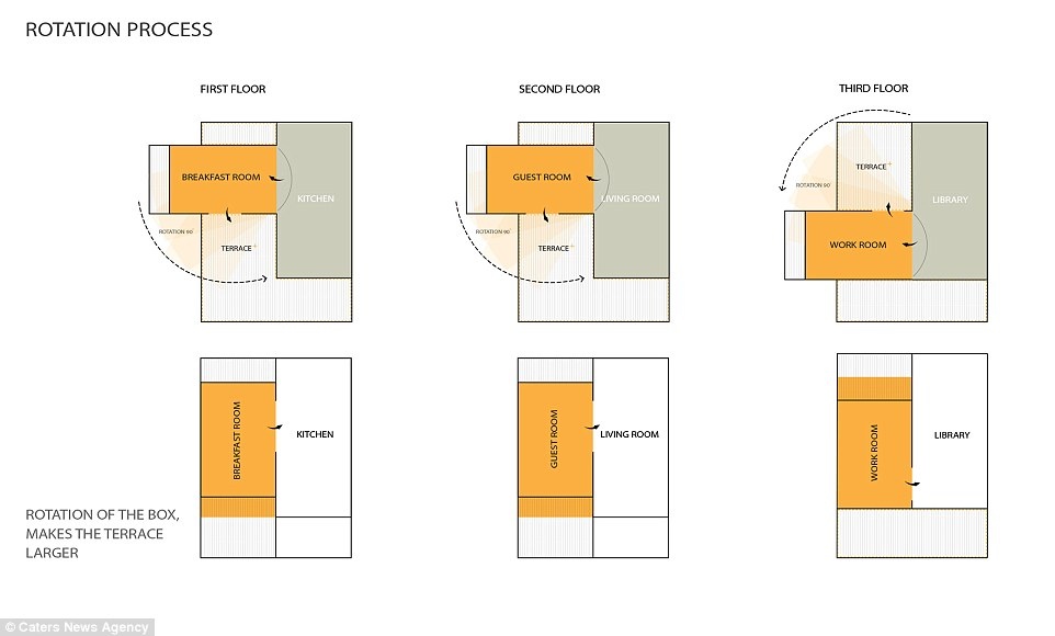 Phòng ăn sáng, phòng ngủ của khách và phòng làm việc có thể quay 90 độ, đồng nghĩa với việc chúng gần như lơ lửng và hướng ra đường.