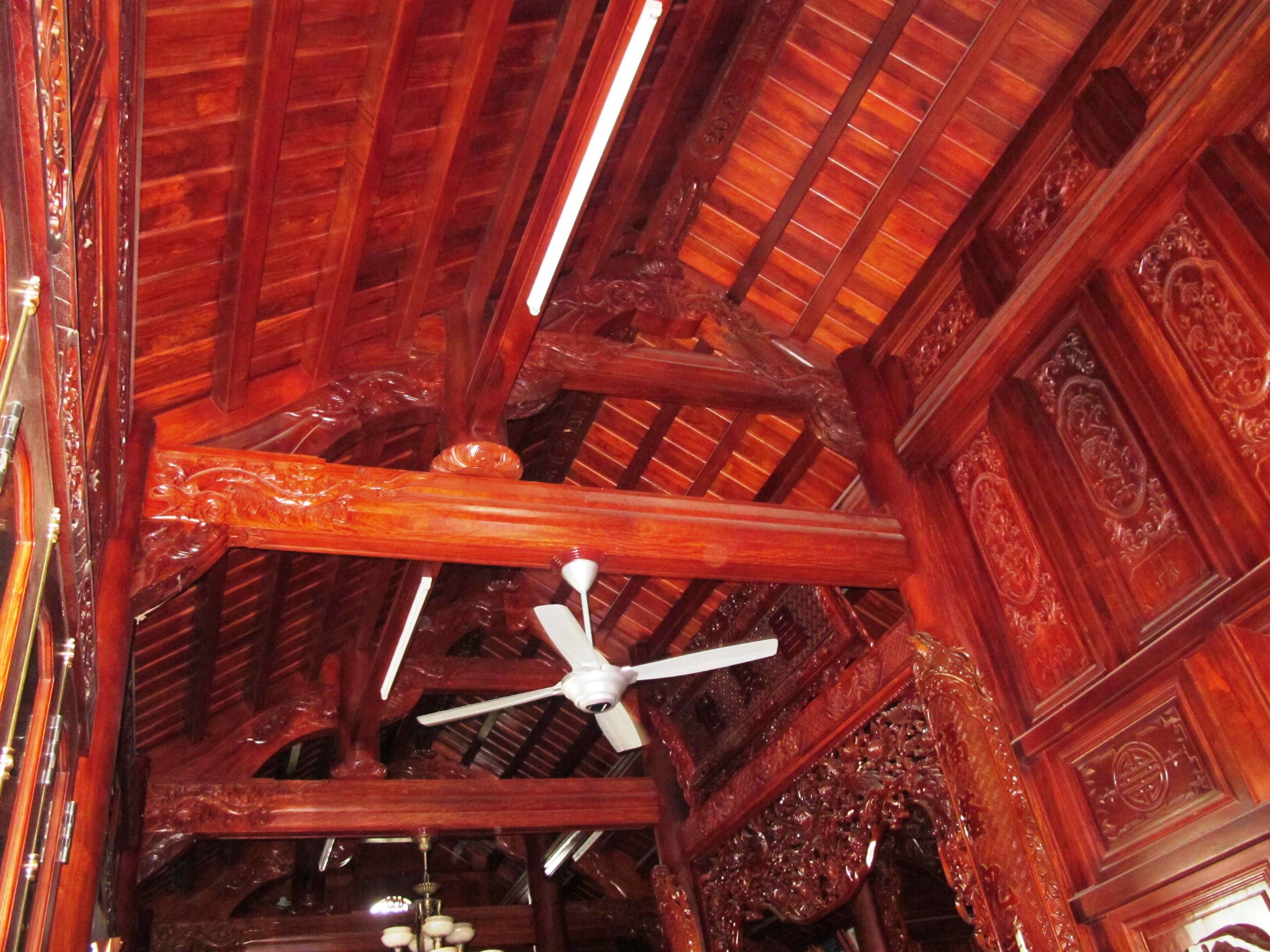 Phía trên trần, đường băng trên nhà làm bằng gỗ nguyên khối và khắc dòng chữ: Phúc Như Đông Hải - Thọ Tỉ Nam Sơn.