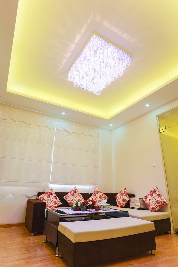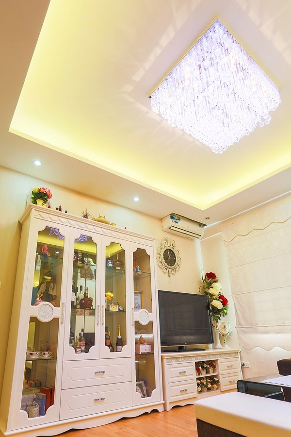 | Chiếc đèn trần sang trọng được đặt giữa phòng khách tạo sự sang trọng cho căn hộ. |