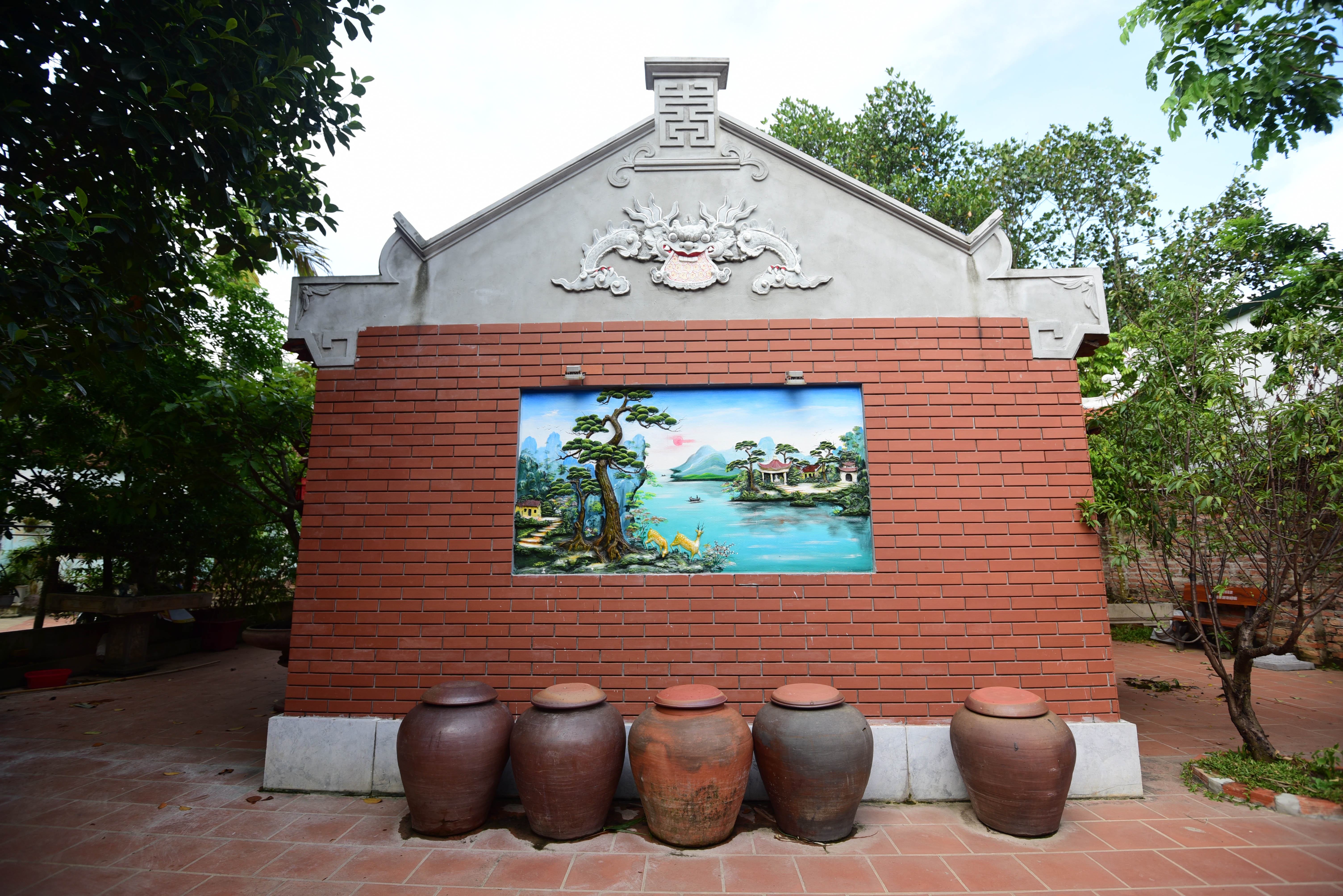 | Phía sau ngôi nhà là bức phù điêu nổi với cảnh non nước hữu tình do các thợ Hà Tây đắp bằng tay. |