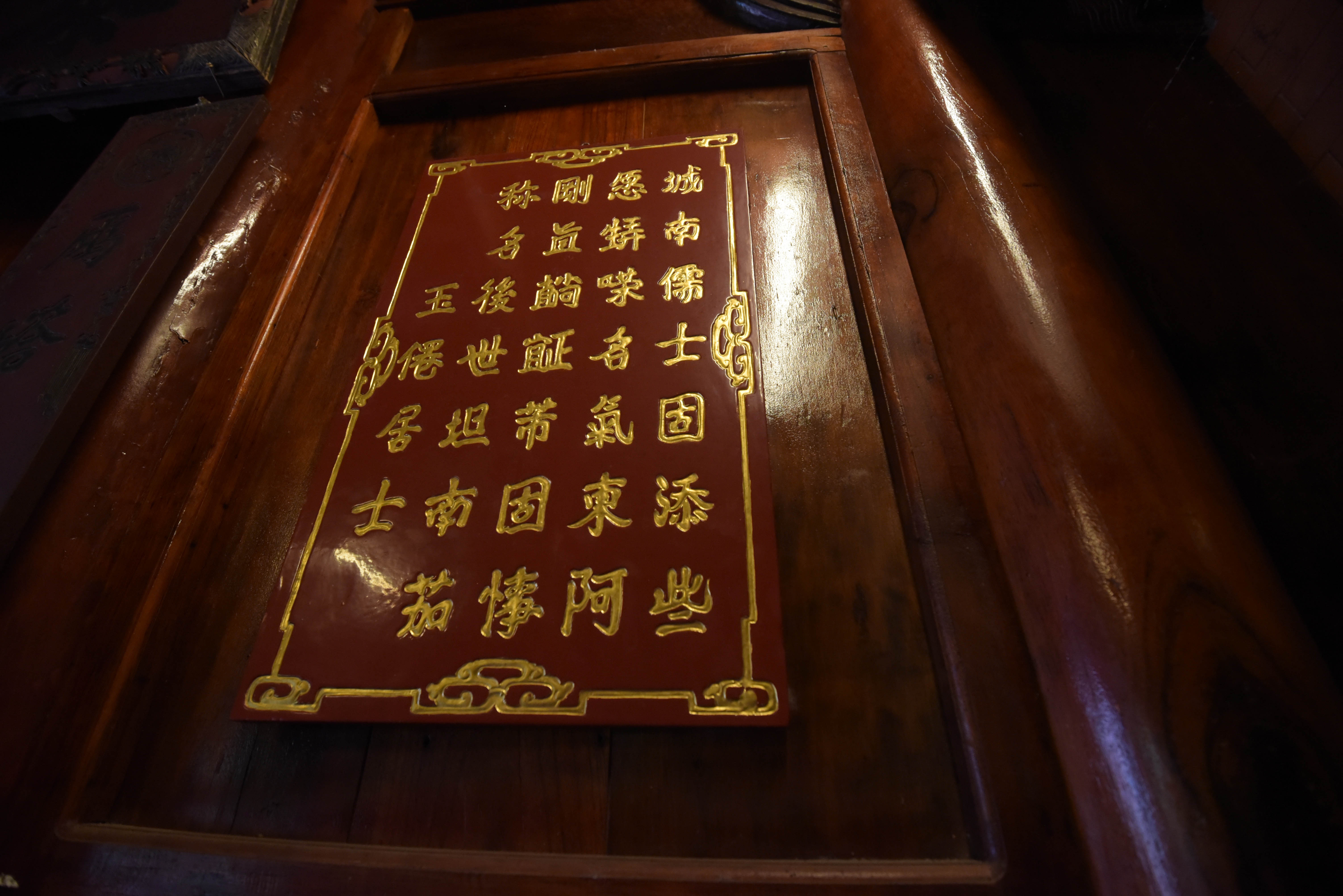 | Trong hình là bài thơ được các nghệ nhân làng nghề Sơn Đồng đục và dát bằng vàng thật. Ngoài ra, trong nhà còn nhiều đồ vật được Vượng Râu rất thích như bài thơ của thiền sư Vạn Hạnh viết trên giấy diều đỏ, bộ hoành phi - câu đối từ thời Bảo Đại... |