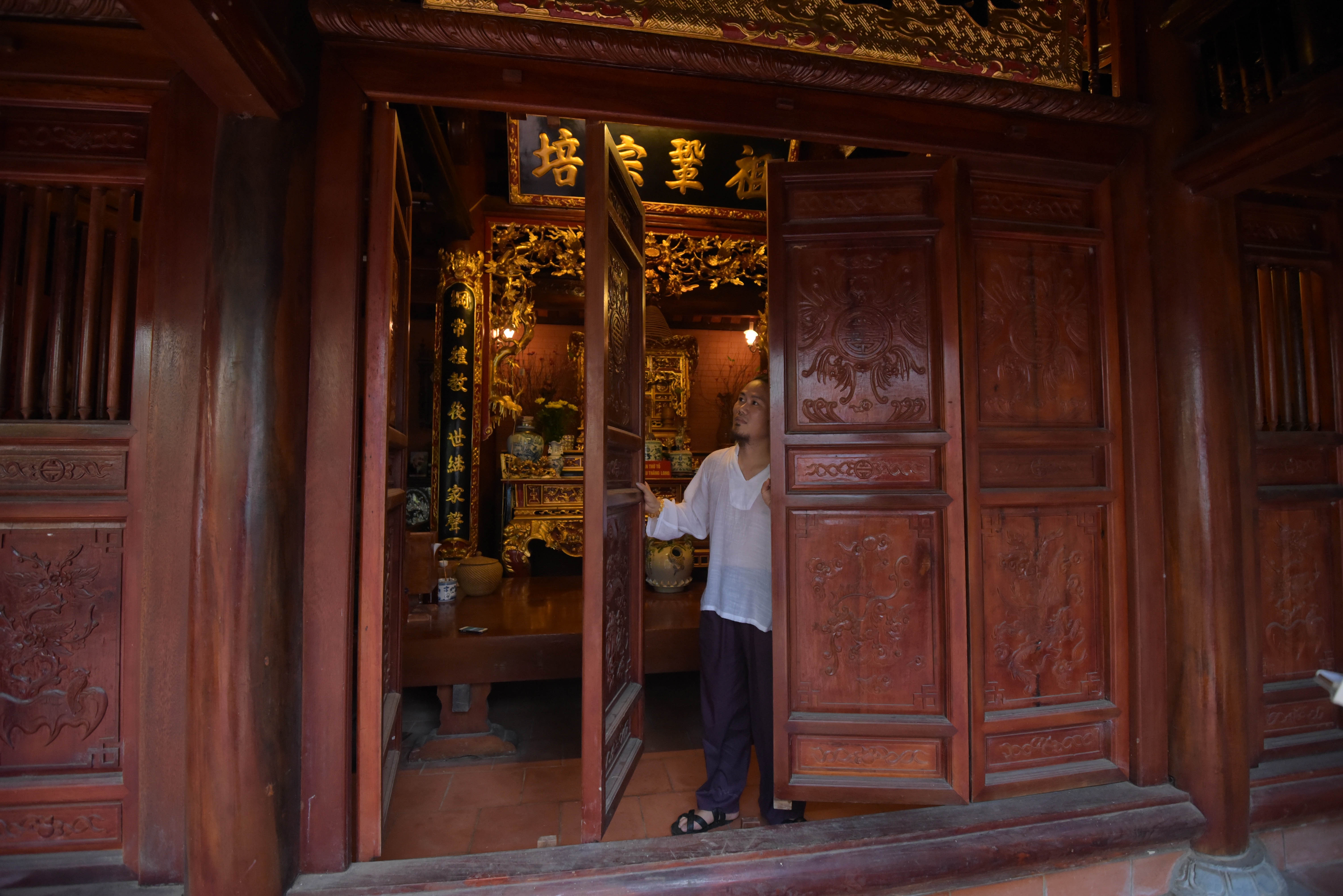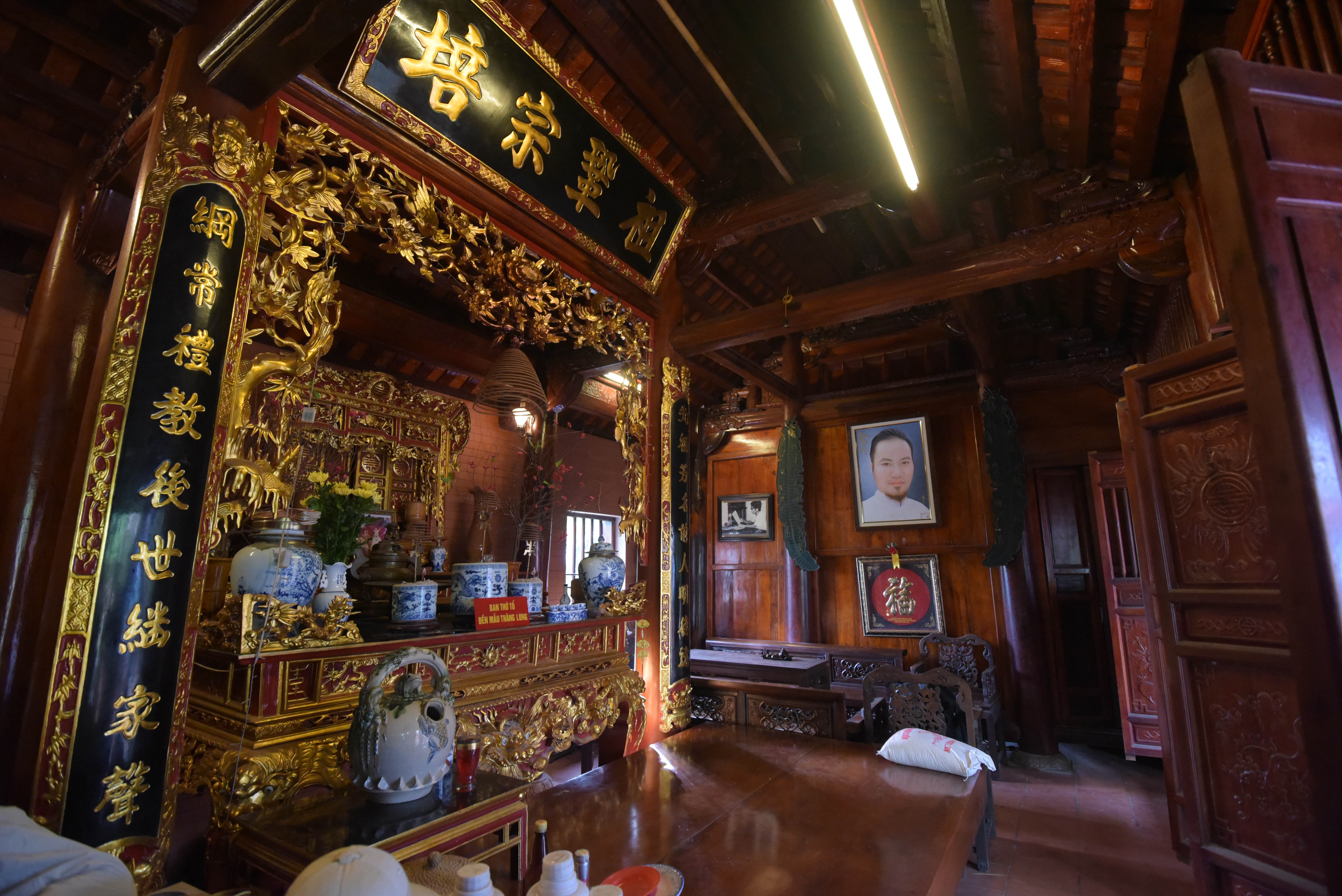 | Toàn bộ công trình được làm bằng gỗ, trong đó có những loại gỗ quý như gỗ lim, gỗ cẩm lai và gỗ sến. Riêng chiếc sập phía trước gian thờ được làm bằng gỗ mít rừng có giá trị khoảng 300 triệu đồng. |