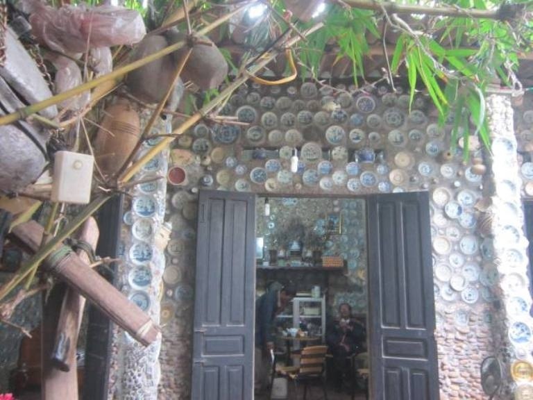 Bên phải cổng là ngôi nhà gắn gần 3000 bát đĩa xưa và ba cây cột trước nhà chi chít tiền xu, khuy áo, đồng xèng cổ.