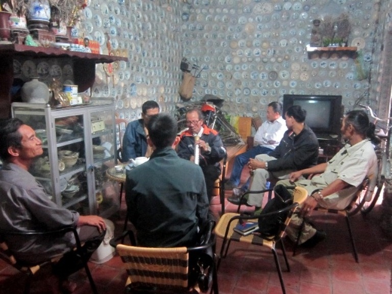 Ông Nguyễn Văn Trường- người sưu tầm và tự tay gắn gần 9000 bát đĩa cổ lên tường nhà. |