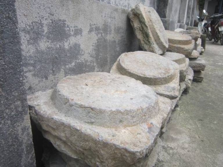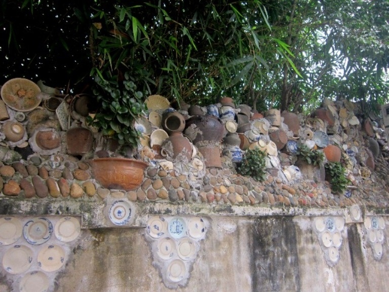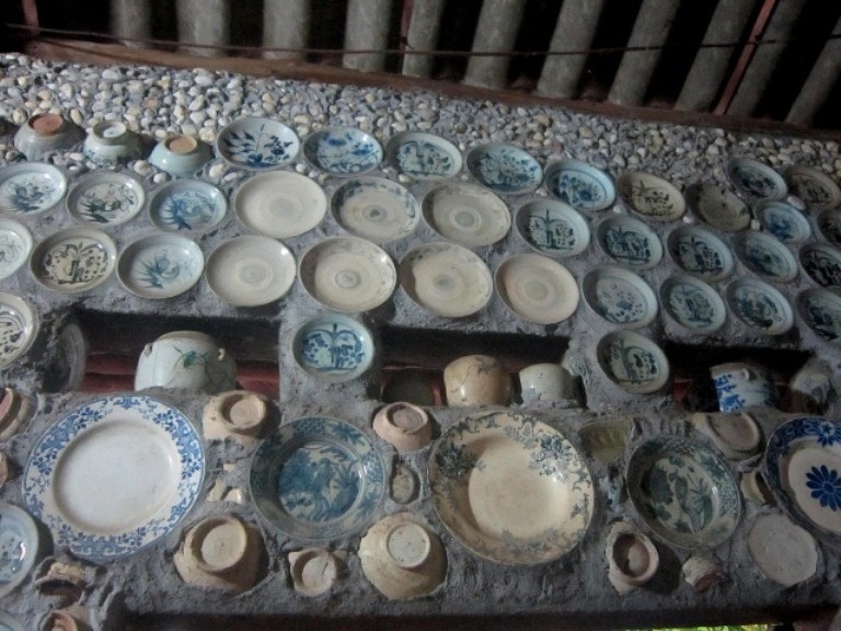 Tường rào, cổng đều được gắn đĩa, bình cổ; cối giã gạo, chân cột nhà đời Nguyễn được xếp ngay ngắn. |