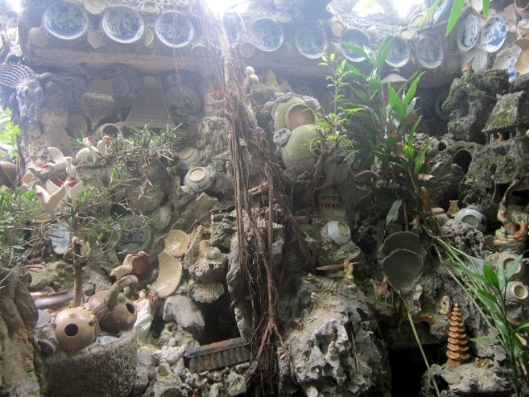 Bước qua cánh cổng, bên phải là hòn non bộ gắn hàng nghìn bát đĩa, mảnh gốm, tiền xu cổ vừa mang nét cổ điển vừa pha chút độc đáo, mới lạ, hiện đại.